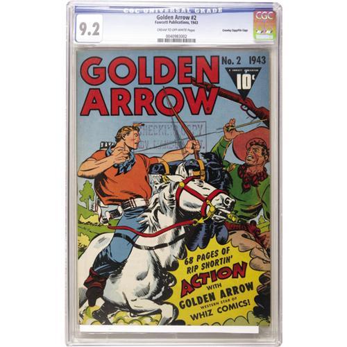 <B>Golden Arrow #2 Crowley Copy/File Copy (Fawcett, 1943) CGC NM- 9.2 Cream to off-white pages.</B></I> Golden Arrow, the Western star of <B>Whiz Comics</B></I> rides into his second solo issue with this 68 page Crowley File Copy which has a Checking Copy stamp on the cover. Overstreet 2006 NM- 9.2 value = $550. CGC census 10/06: 1 in 9.2, none higher.<BR><BR><b>Shipping:</b> Slabbed Comic (<a target="_blank" href="http://www.heritageauctions.com/common/shipping.php">view shipping information</a>)