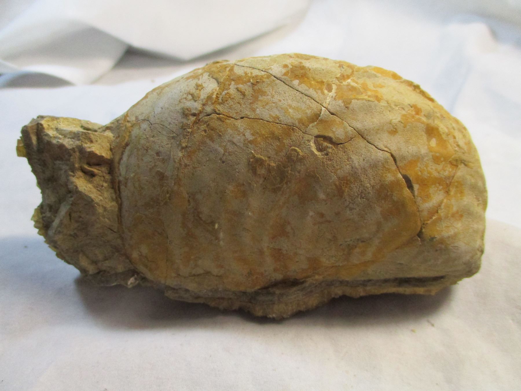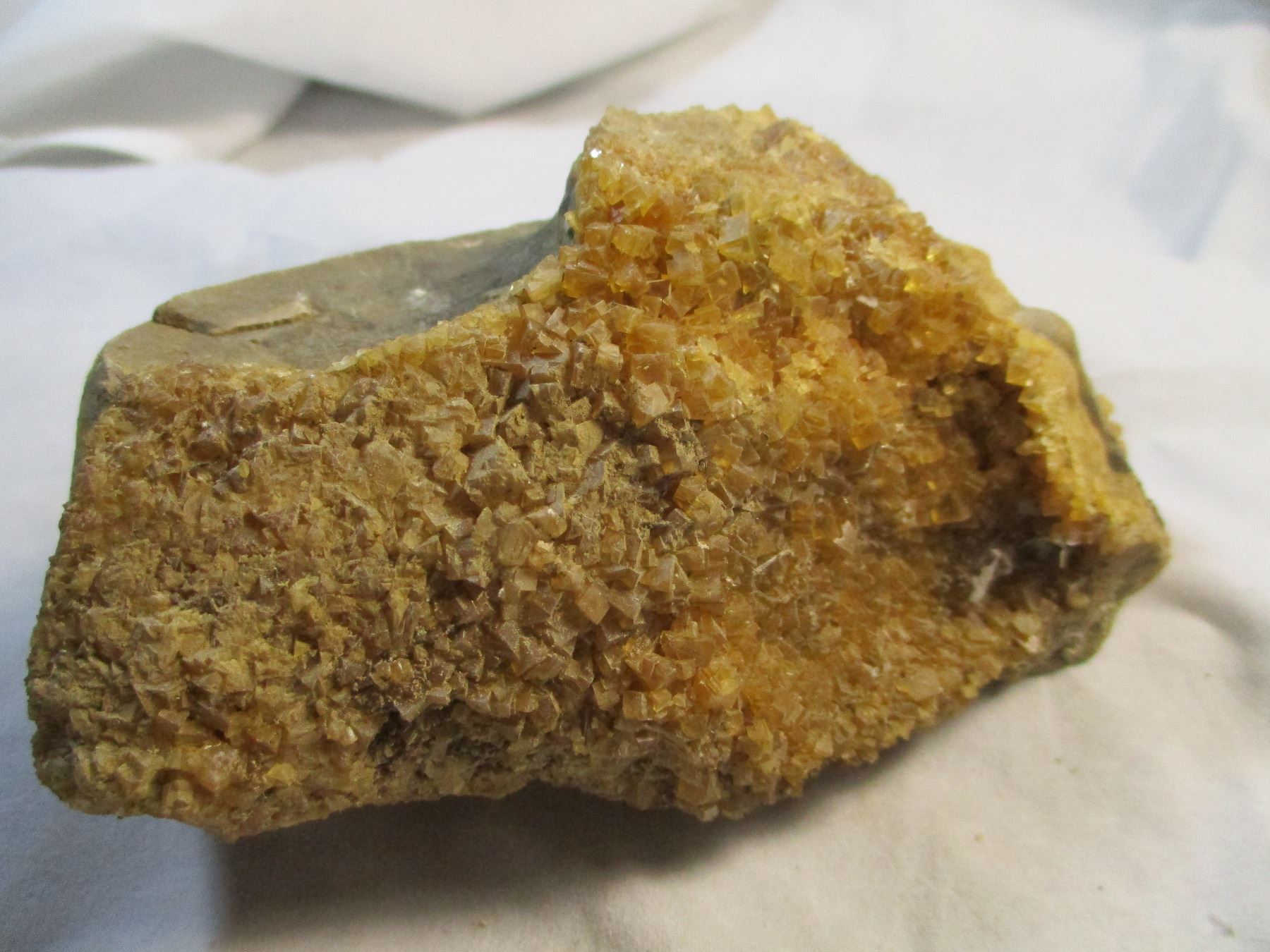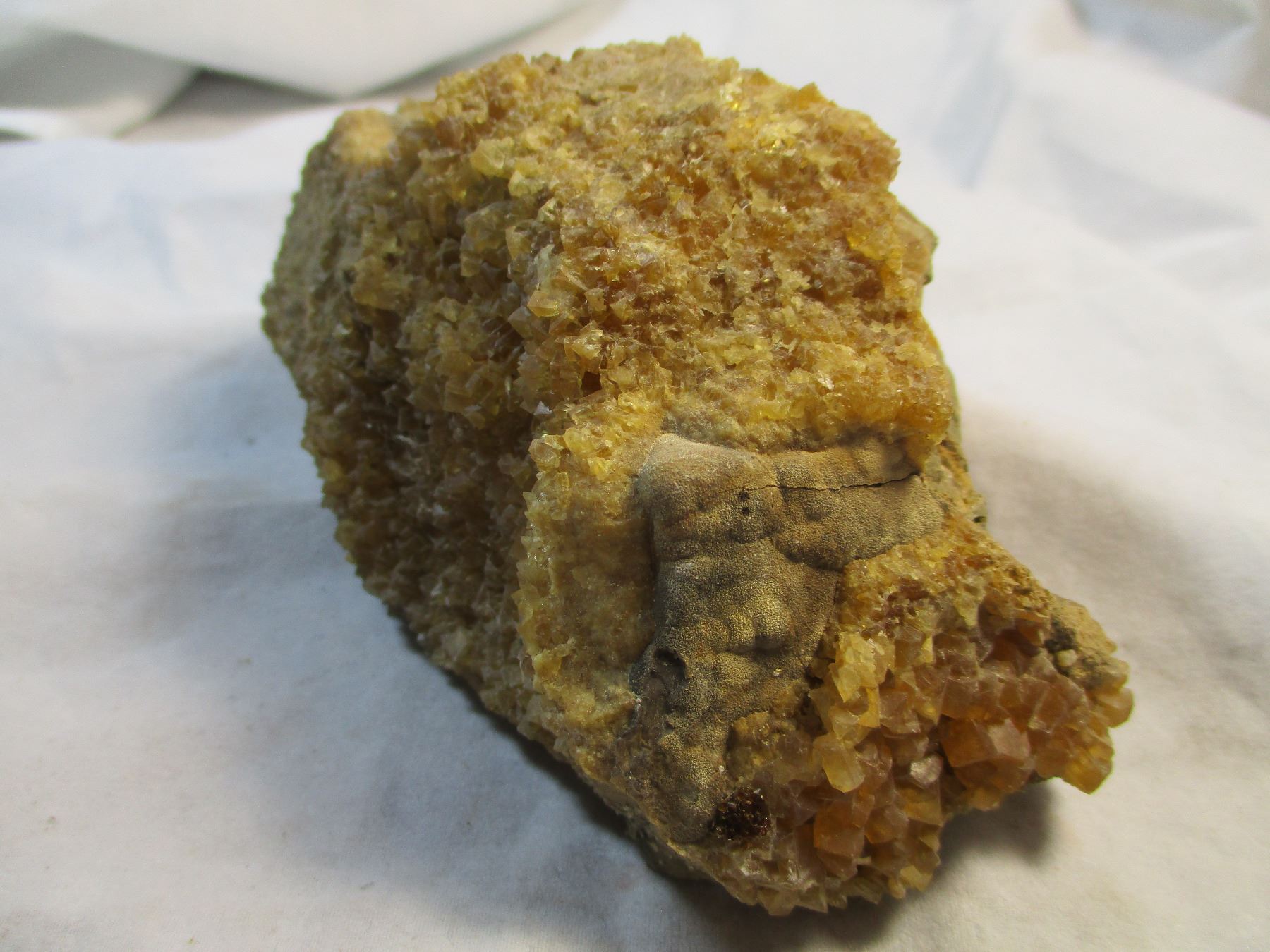 Very cool golden barite crystals on a large clam shell fossil from the Black Hills of South Dakota.