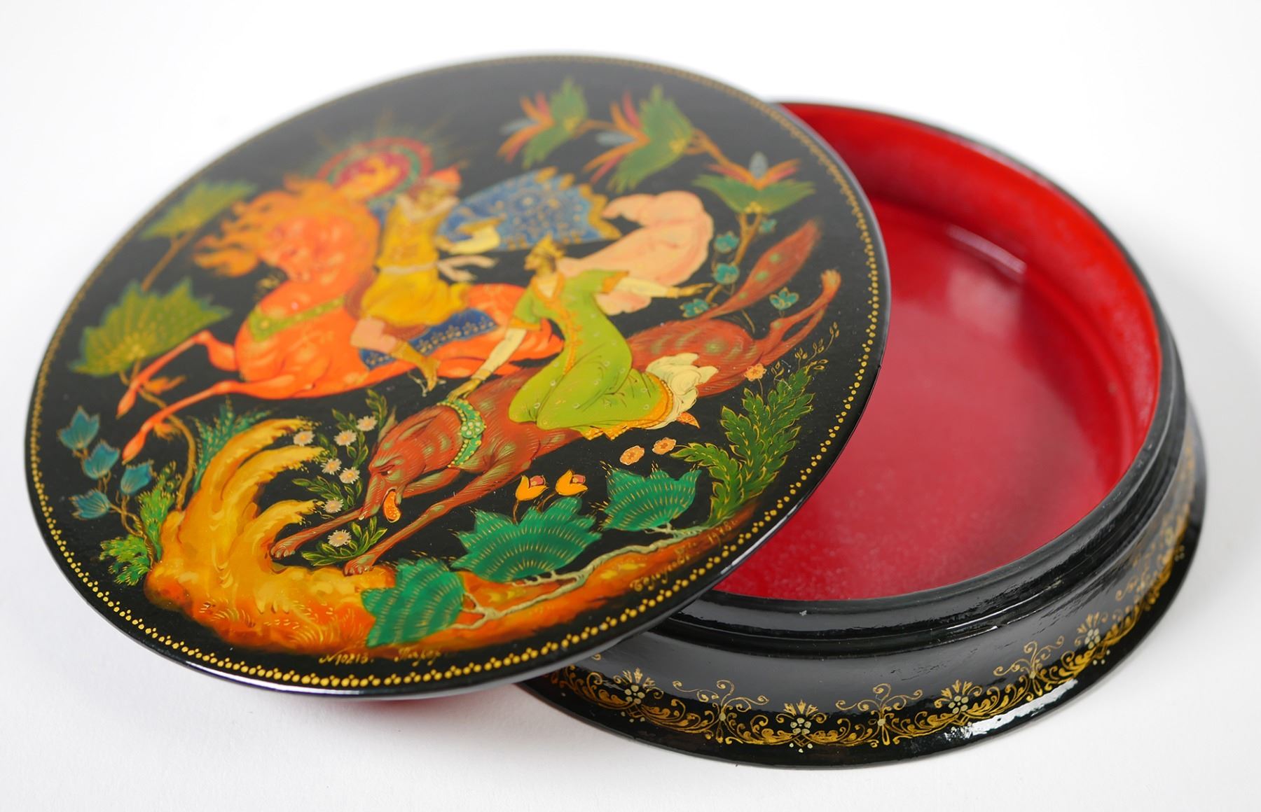 The Golden Cockerel. Finely detailed Russian Lacquer box, decorated in Palekh and signed by the artist, dated 1978. Round box measures 4" diameter. Excellent condition with no damage or repairs.