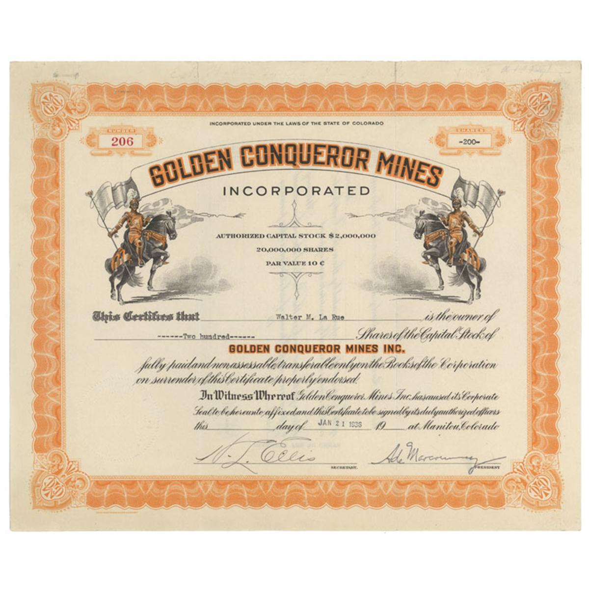 1936, Colorado. Stock certificate for 200 shares. Orange/Black. Vignette of company title within a banner held by kights on horseback. Tape repair at fold splits on verso. Staple holes at upper left. Uncancelled and fine.