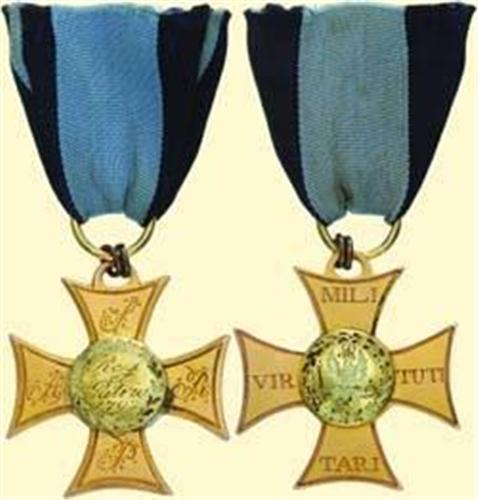 Golden Cross (4th class) - Type 1808; breast badge, gold, flat version, with gold medallions without enamels (only engraved), engraved borders and inscriptions, with later added suspension ring with ribbon. Very attractive rare decoration of high impression!