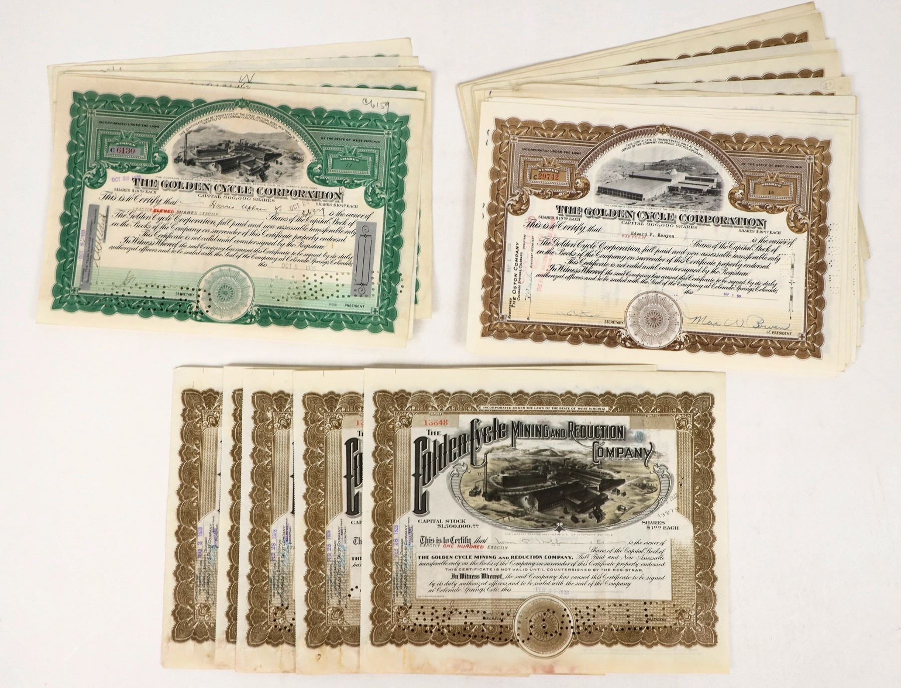 Golden Cycle Corporation and Golden Cycle Mining and Reduction Company Stock Group. About 35+ certificates. 2 colors (green and brown) and 3 different vignettes. Issued and cancelled. Dates range from 1925-1960 approx. Nice group of Cripple Creek Mining Stocks. Many w/revenue stamps on reverse.