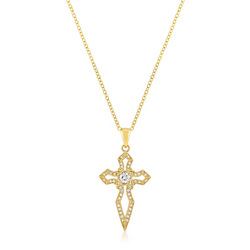 Proudly display your faith with this elegant cross pendant! 18k plated gold is achieved using an electroplating process that coats the item with heavy layers of 18k Yellow Gold and color-treated to display a perfect 14k Hamilton gold color.Base Metal: Lead Free Alloy (Brass)Style: , Setting Type: ProngsMaterials: , Stone Cut: RoundCarat Weight: .67 (ct)Color: , Plating Color: Goldtone finishChain Clasp: 11.00Chain Length: 16 Inch + 3 Inch ExtenderPendant Bail Type: TraditionalBracelet Size: Pendant Dimensions: 36 mm L x 23 mm W x 5 mm Hecklace Chain Type: LinkStone Size: 5 mm| 1.3 mmType: Pendant