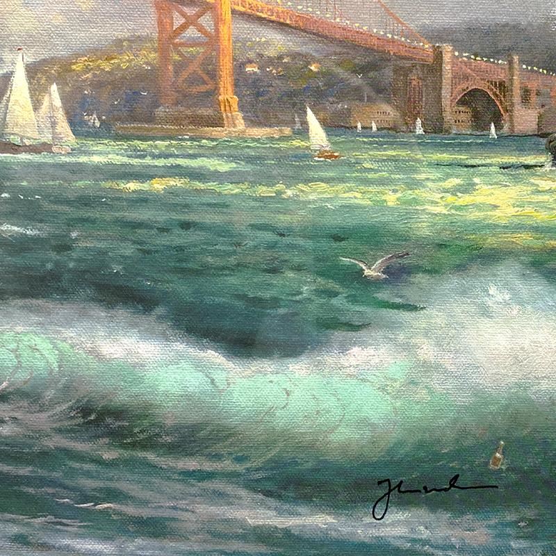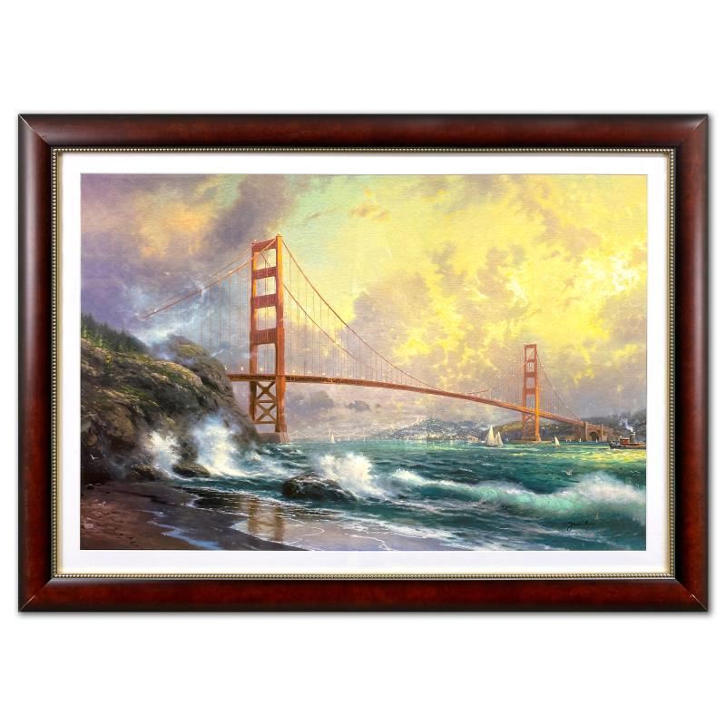 "Golden Gate Bridge, San Francisco" is a limited edition offset lithograph on paper by Thomas Kinkade (1958-2012), numbered and bearing Kinkade's authorized signature. This piece is framed. Measures approx. 31.5" x 43.5" (frame), 23.5" x 35.5" (image). There is some minor wear on the frame.