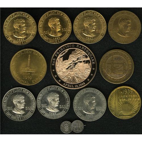 <B>Golden Gate International Exposition So-Called Dollars and Others.</B></I> Consists of an HK-487, a very scarce piece in silver with a pair of them made into a lapel broach; HK-486; and HK-484 Type II. The balance of the lot consists of Lucky Lindbergh tokens and commemorative medals of the San Francisco earthquake. The current market value of the lot is approximately $150-$300.<BR><BR><b>Shipping:</b> Coins & Currency (<a target="_blank" href="http://www.heritageauctions.com/common/shipping.php">view shipping information</a>)