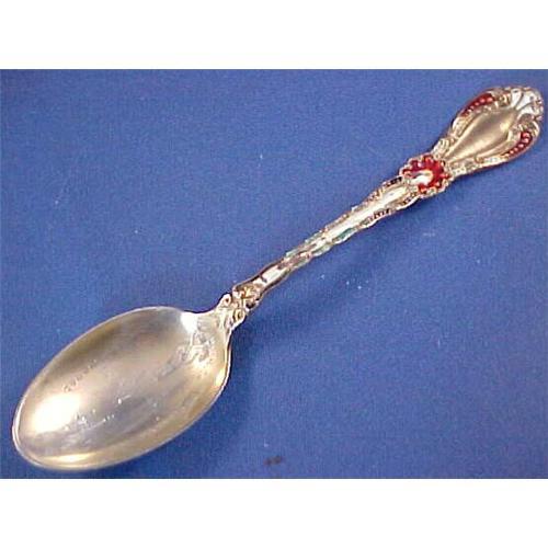 What a gorgeous sterling silver souvenir spoon! It measures 6" long and is completely gold washed or vermeil. The pattern is called Orient by Alvin. The bowl has an engraved depiction of the Golden Gate San Francisco (pre-bridge). The front of the handle is highlighted by touches of enamel. Although there are chips in the enamel, it is a lovely touch! This spoon is otherwise in excellent condition and will cost $4 to ship to US addresses.