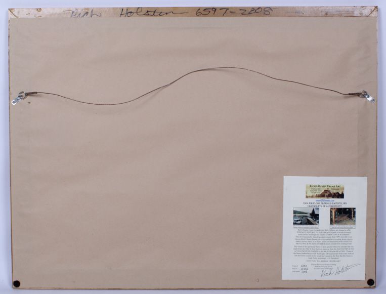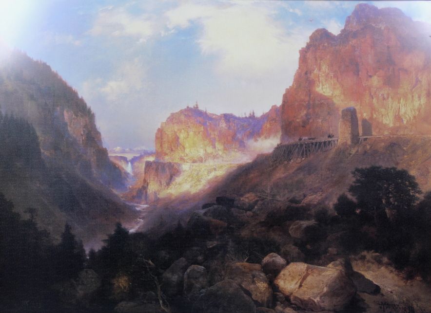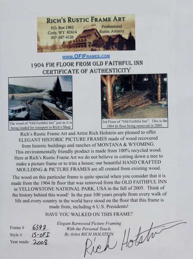 This is a print of the Painting done by Moran in 1893 of the Golden Gate Canyon through Yellowstone National Park. This poster shows great colors of the view looking down the canoyon in Yellowstone National Park. YNP is the oldest and most notable national park that began by the efforts of President Theodore Roosevelt. This is framed in the 1904 Fir Wood Floor from the Old Faithful Inn in Yellowstone National Park with the certificate of Authenticity on the back. Think of the history behind this wood. In the past 100 years, people from every walk of life and country in the world have stood on these floors, even including 6 United States Presidents. The frame is made by a Emigrant, Montana man and the wood is highly collectible. The frame measures 27”x35.25" and the artwork is 22.25”x30.5"