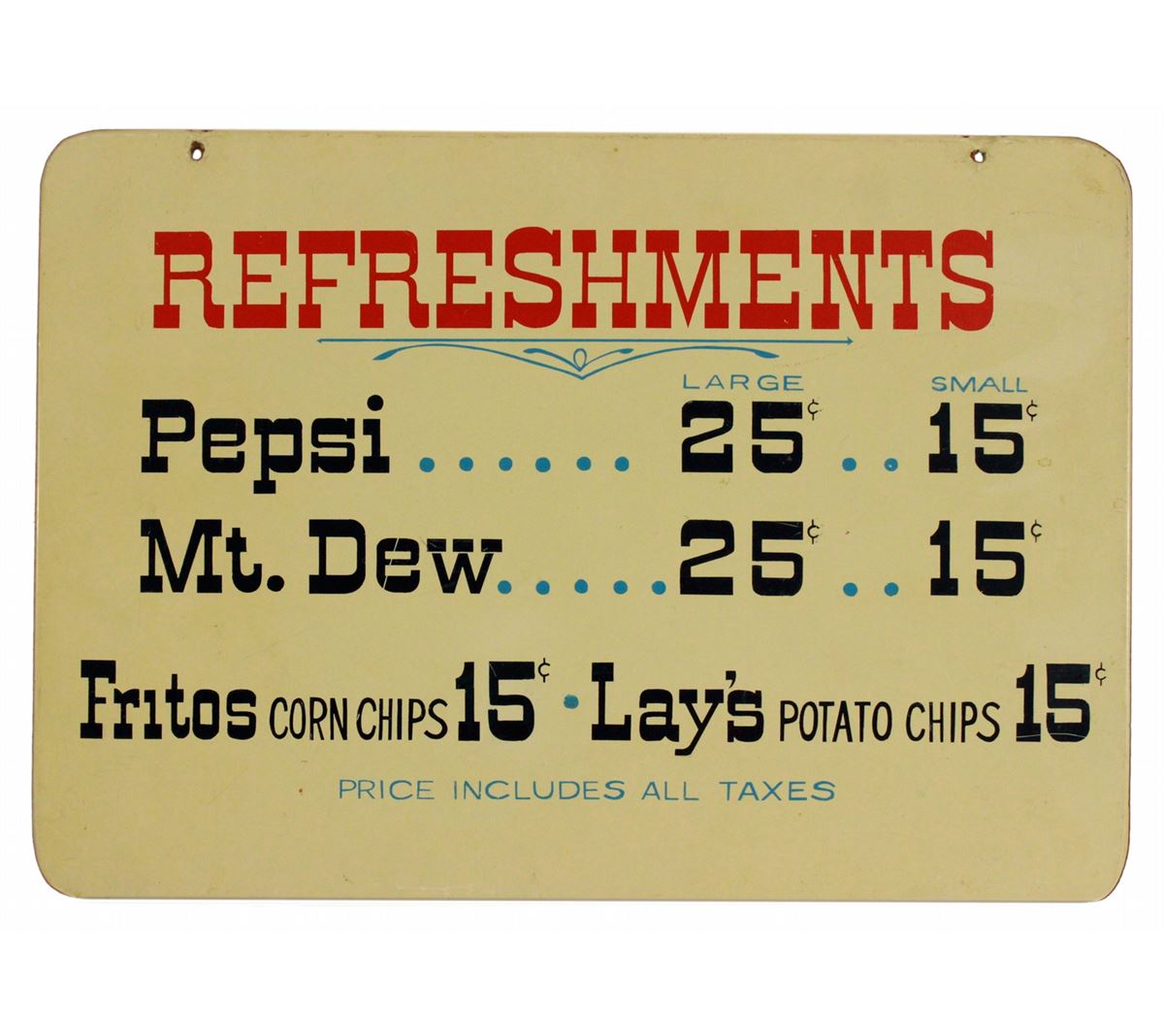 (Disneyland, 1960s) Original 1960s era refreshment sign from the Golden Horseshoe Revue. The silk-screened Masonite sign measures 10 x 14 in. In very good condition with some wear to paint.