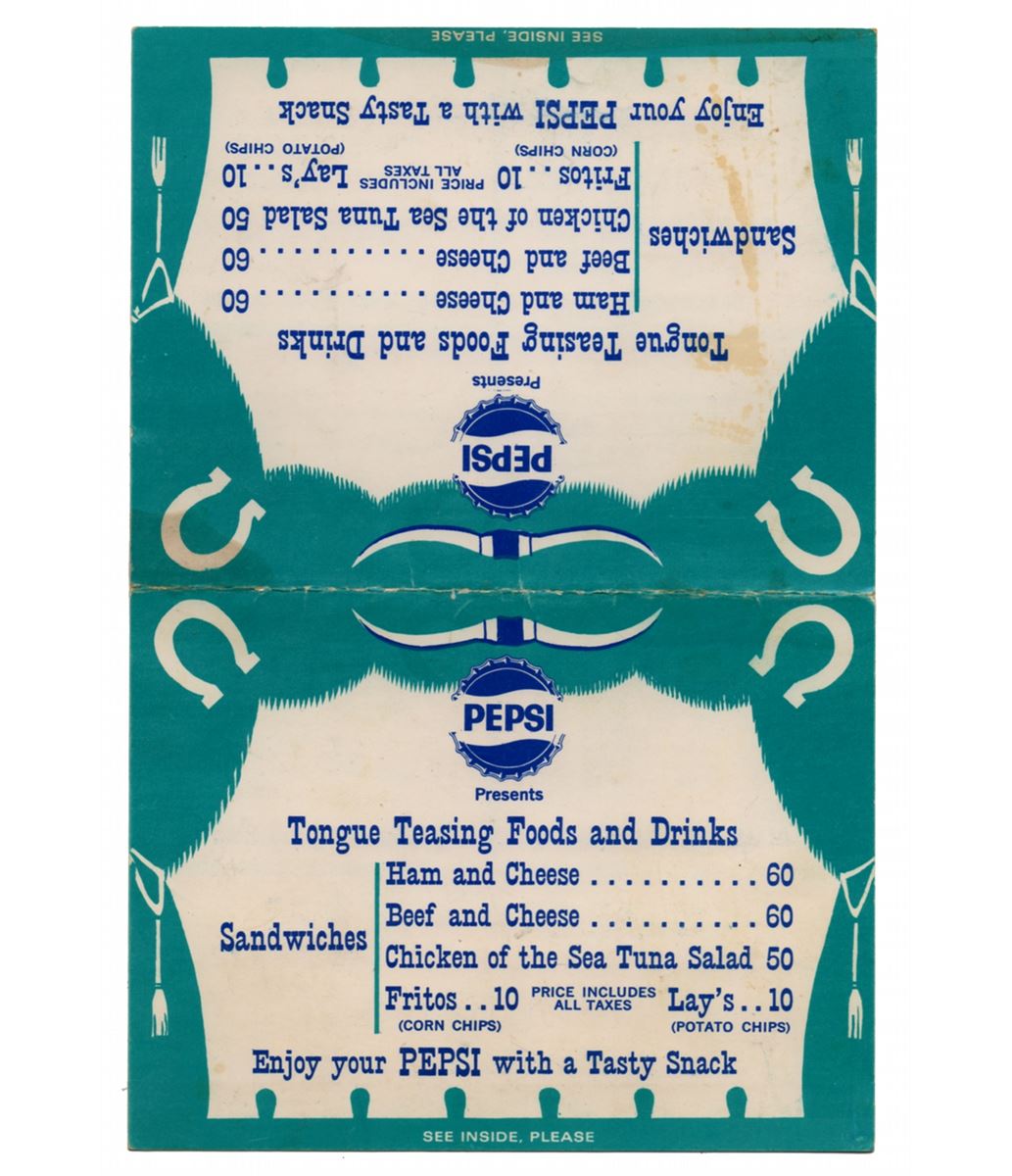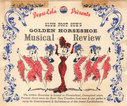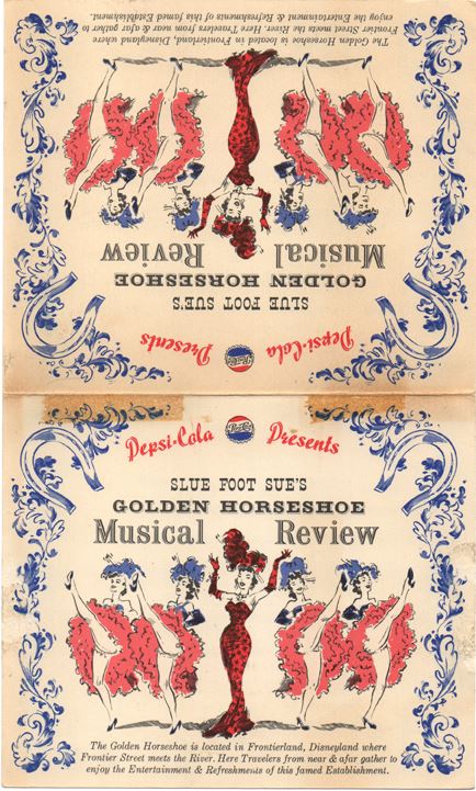 (Disneyland, 1955/1962) A pair of early table card menus and program for Slue Foot Sue’s Golden Horseshoe Revue. The first dates from 1955 to early 1956 when Judy Marsh was still in the role of the racy saloon owner. The second dates from 1962. Each measuring 5 x 6 in. and in very good condition overall.