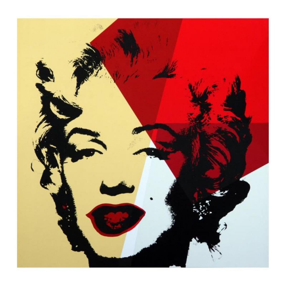 "Golden Marilyn 11.42" is a limited edition silk screen print on museum board from Sunday B Morning featuring the works of Andy Warhol. The piece is stamped in blue on the back with "Published by Sunday B. Morning" and "fill in your own signature" and is accompanied by a certificate of authenticity. Measures approximately 36" x 36".