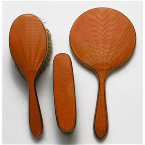 This lovely old dresser set was produced in golden orange guilloche enamel with copper fittings circa 1930/40's. Consisting of a 9 inch brush with natural bristles ? a 12 inch bevelled mirror ? 7 inch clothes brush with natural bristles. With the exception of a little wear to the brushes, due to age, all three pieces are in excellent condition