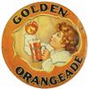 Golden OrangeadeTwo Sided Tin Sign. Age discoloration and paint loss mostly at perimeter edges. Fair to good condition/back side poor condition. 13 1/2 inch diameter.