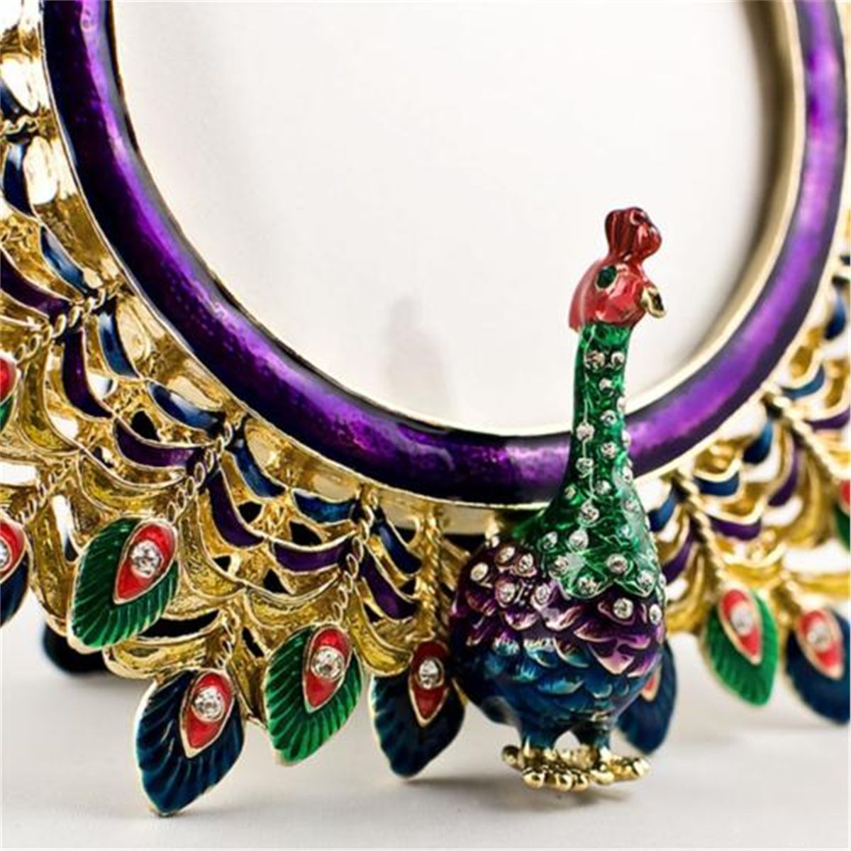 Golden Peacock Faberge Frame, Each piece of the Golden Picture Frame is carefully crafted from pewter and hand enameled afterwards to reach this multi colored piece of art. The peacock stands proudly in front of the frame with its feathers standing grandiosely upwards ornamented with sparkling crystals. Dimensions: 5in (D), Material: Pewter, Enamel, Crystals.