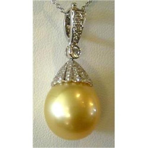 18K White Gold tested with 18K acid. A golden pearl, which measures a half inch in width and height is set in a diamond cone. Pearl enhancer