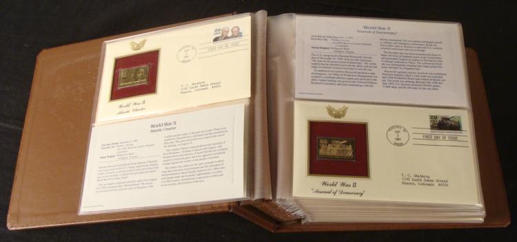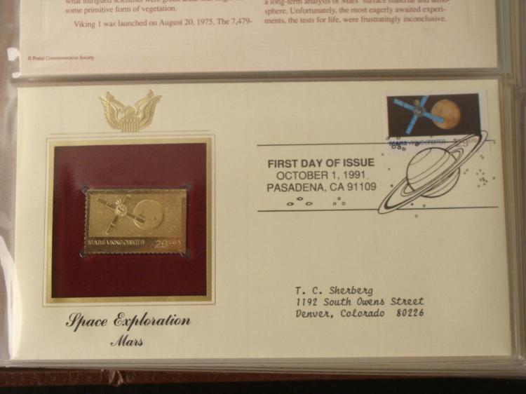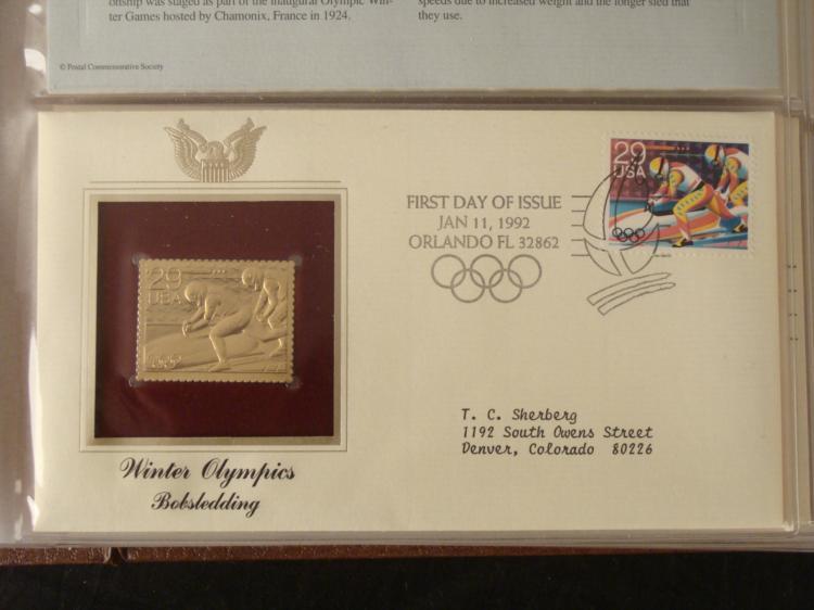 This is an official Postal Commemorative Society collection of Golden Replicas of United States stamps. Each envelope features a First Day Cover, and a proof replica stamp in 22 kt gold. This bound volume contains 41 covers, postmarked from September 3, 1991 to May 29, 1992. Series include Space Exploration, Winter Olympics, and Love. The gold stamps are set in cut-out windows with matting. The envelopes include information and history on back. All are in excellent condition, in plastic sleeves. * There are some great stamp designs here, and the gold stamps really enhance the whole set.