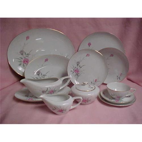 Golden Rose China by Fine China of Japan has delicate pink roses with gray leaves and gold trim. This 96-piece set includes one 14" platter, one 10-3/8" oval vegetable bowl, one 3" gravy boat with underplate, one creamer, one sugar bowl with lid, 12 - 10-1/4" dinner plates, 12 - 7-5/8" salad plates, 12 - 5-1/2" berry bowls, 11 - 6-3/8" bread and butter plates and 16 cup and saucer sets. All pieces are in very nice condition with the exception of a chip on one bread and butter plate and a chip on one coffee cup. The year made is unknown.