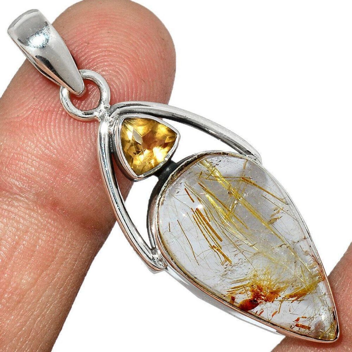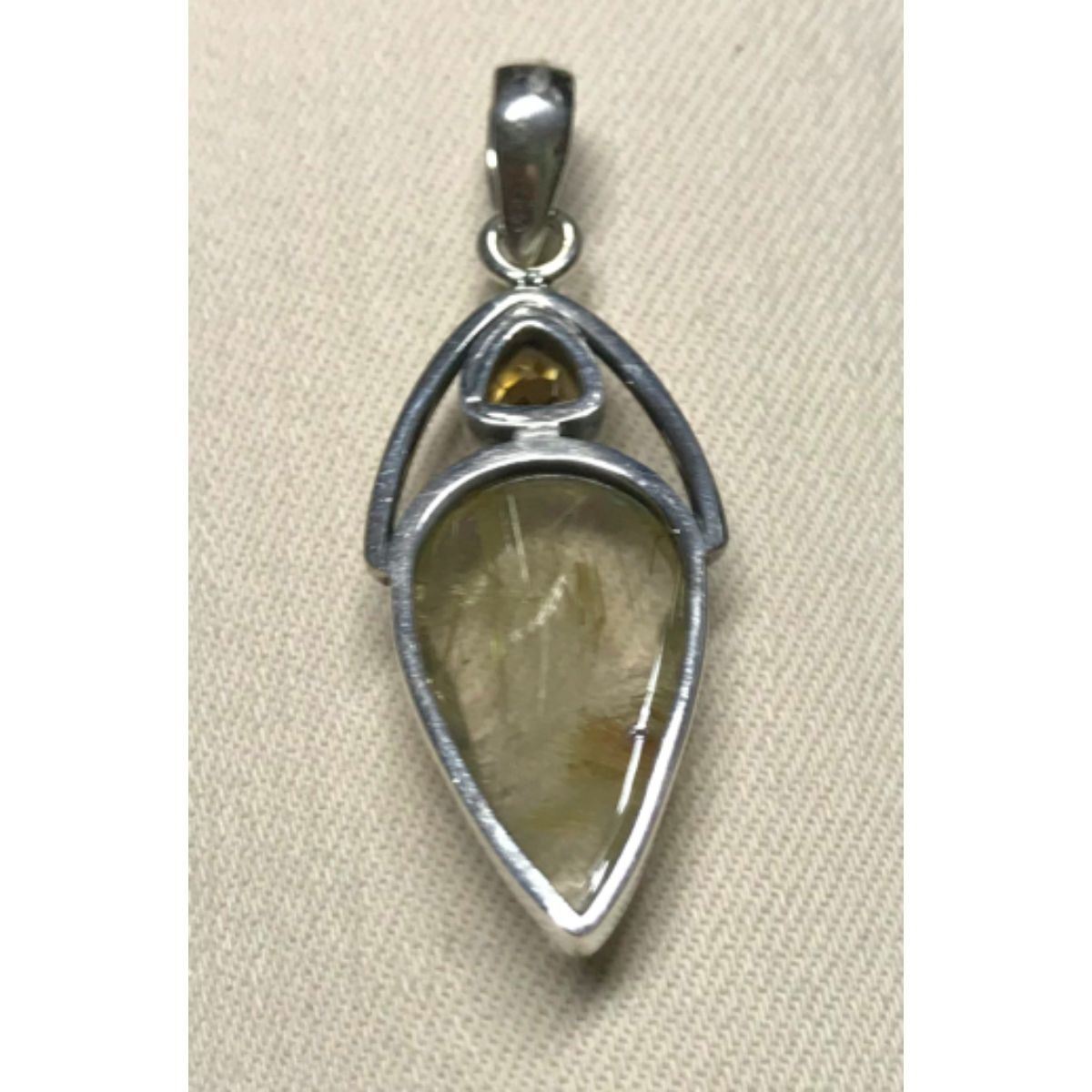 Pear shaped polished golden rutile quartz & trillion cut citrine gemstone, set into a sterling silver modern style pendant. 1 7/8" L X 3/4" W. 6 grams weight, gemstones & silver. Golden Rutile is known to clear energy blockages of all the chakras (energize them) & stimulates the alignment of the mind & body & helps to strengthen your willpower & motivation.