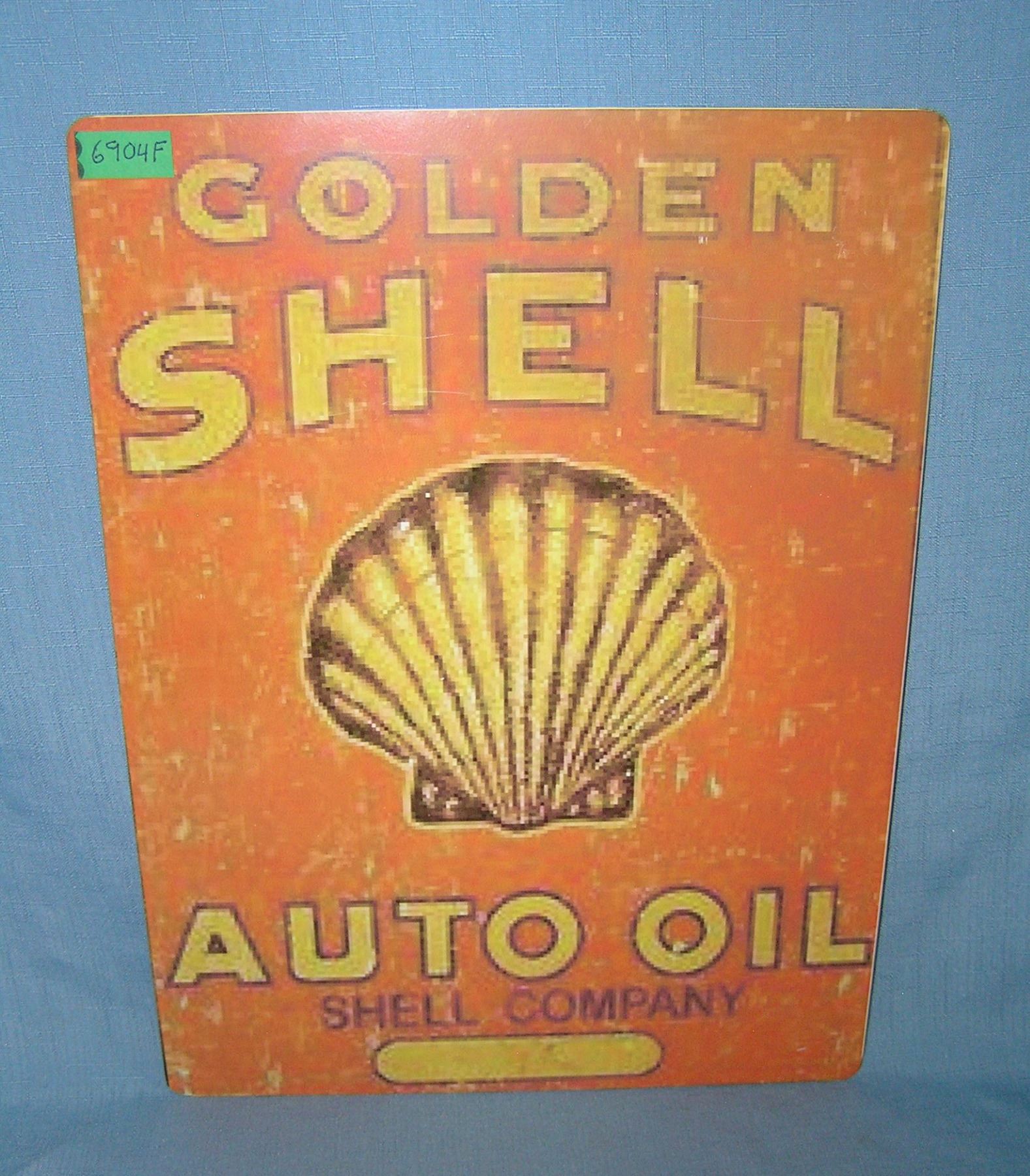 Golden Shell Auto Oil  retro style advertising sign printed on PVC hardboard these signs are auctioned for their decorative and display purposes 12 inches by 16 inches est. value $50.00-$60.00
