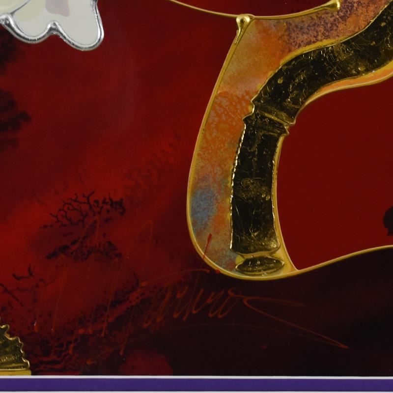 "Golden Shimmer" is a limited edition mixed media silkscreen on paper by Martiros Manoukian, PP numbered 3/15 and hand signed by the artist. This piece comes custom framed with a mirror-like finish. Includes Letter of Authenticity. Measures approx. 36.5" x 30.5" (frame), 28" x 22" (image). There are minor imperfections on the frame (particularly, minor scuff on bottom-left corner) that is only visible upon close inspection.