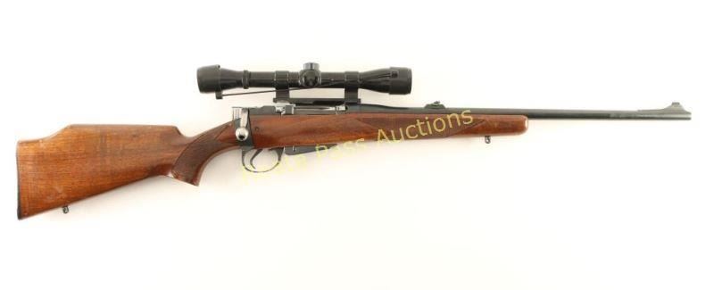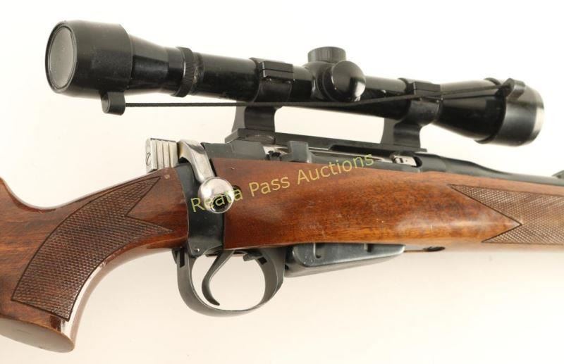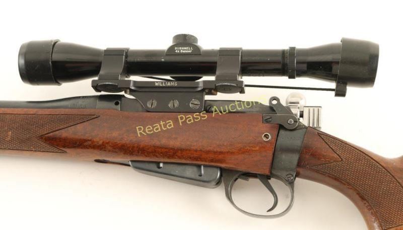 SN: 455300. Remanufactured in USA bolt-action military British Lee-Enfield No4 Mk1 battle rifle with a 22" barrel, custom 2-piece wood stock, sling studs, aftermarket front and rear sights, Bushnell 4X Banner scope on Williams base and one detachable magazine. Metal finish has a little edge wear. Bore is bright and shiny with good rifling. Action works well. Wood has finely checkered panels on forend and pistol grip. There is a Monte Carlo comb with cheek rest for right-handed shooters. It has a black plastic butt plate from Santa Fe. There are many rubs, scrapes and scratches but none are deep. Condition is good to very good. *Modern Firearm C&R*