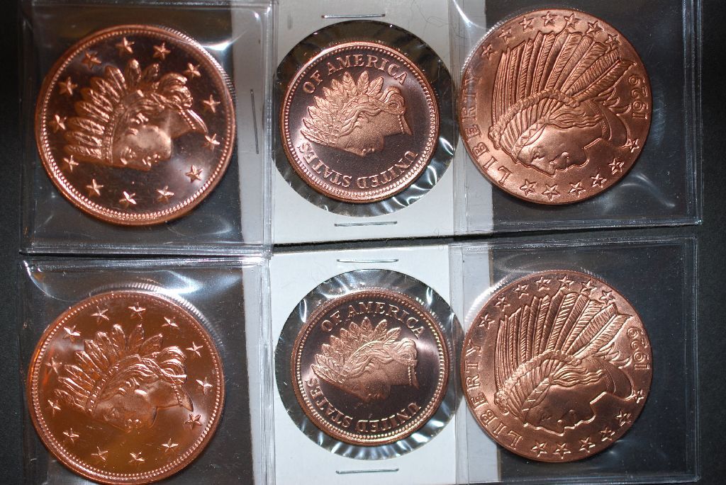 Golden State Mint Copper Round; .999 Fine Copper 1/2 Oz. (2), Copper Round; .999 Fine Copper 1 Oz. (2) "Indian Head" & Golden State Mint Copper Round; .999 Fine Copper 1 Oz. (2) "1929 Indian Chief"; Total Lot of 6