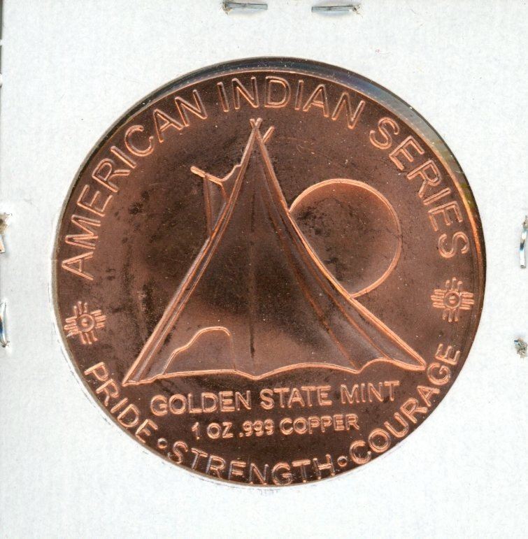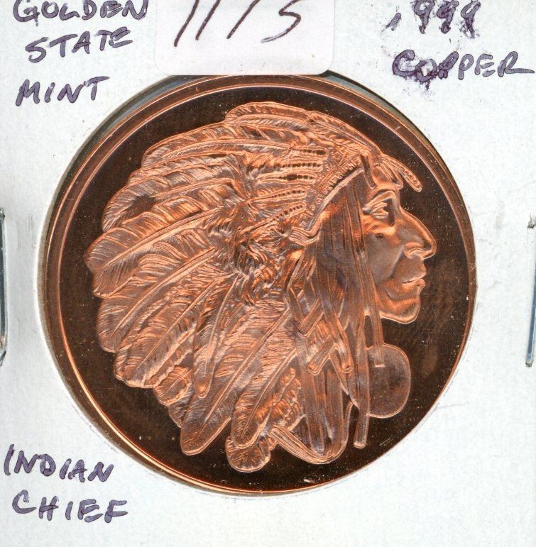 Golden State Mint one ounce .999 pure Copper Indian Chief Round. BU. Nice.