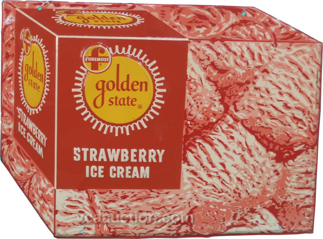 Golden State Strawberry Ice Cream Embossed Die-Cut Tin Sign, In Shape Of A Box Of Ice Cream - 24" x 17" Mint Condition