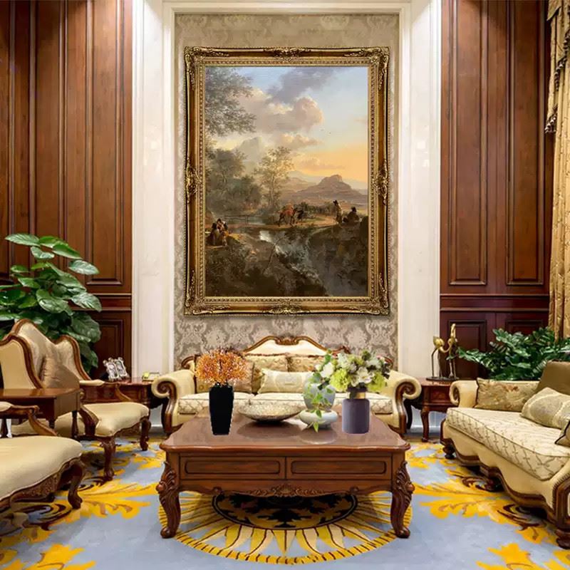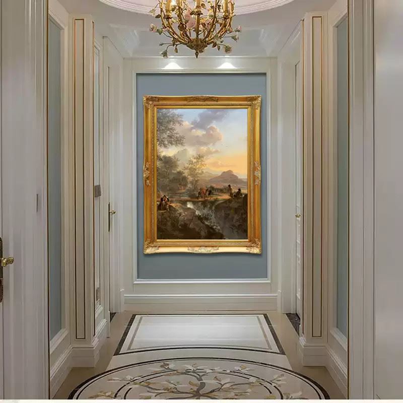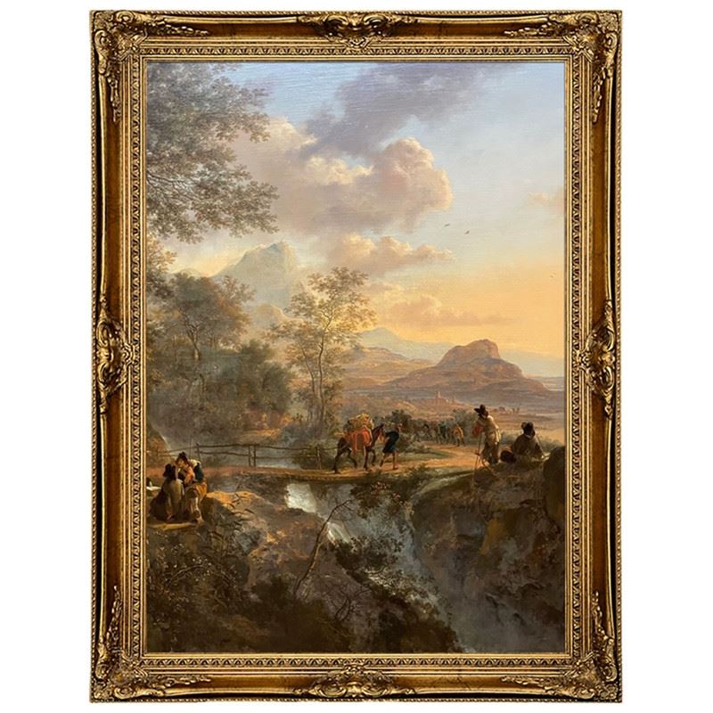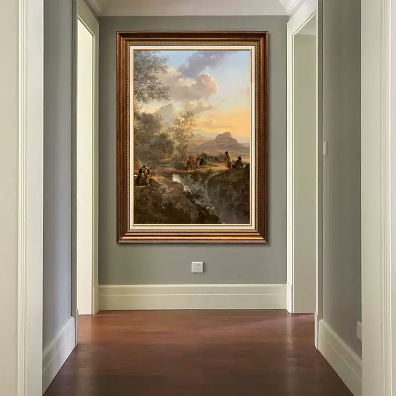 Under the golden evening light, travelers follow a mountain path while others rest by the stream. The distant peaks and sky glow softly with the colors of sunset. Dimensions: 28 x 35 inches.