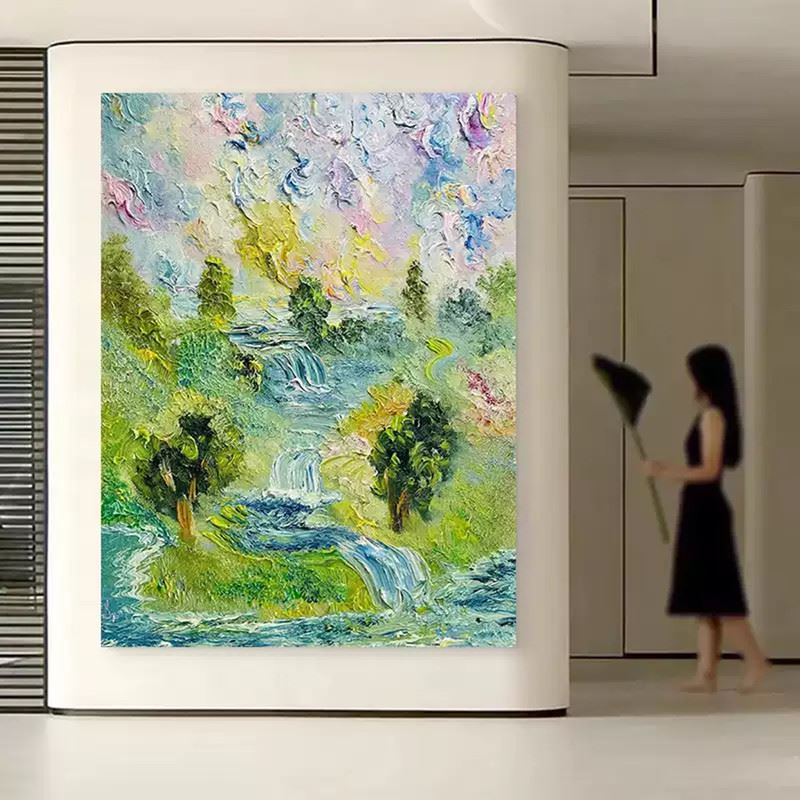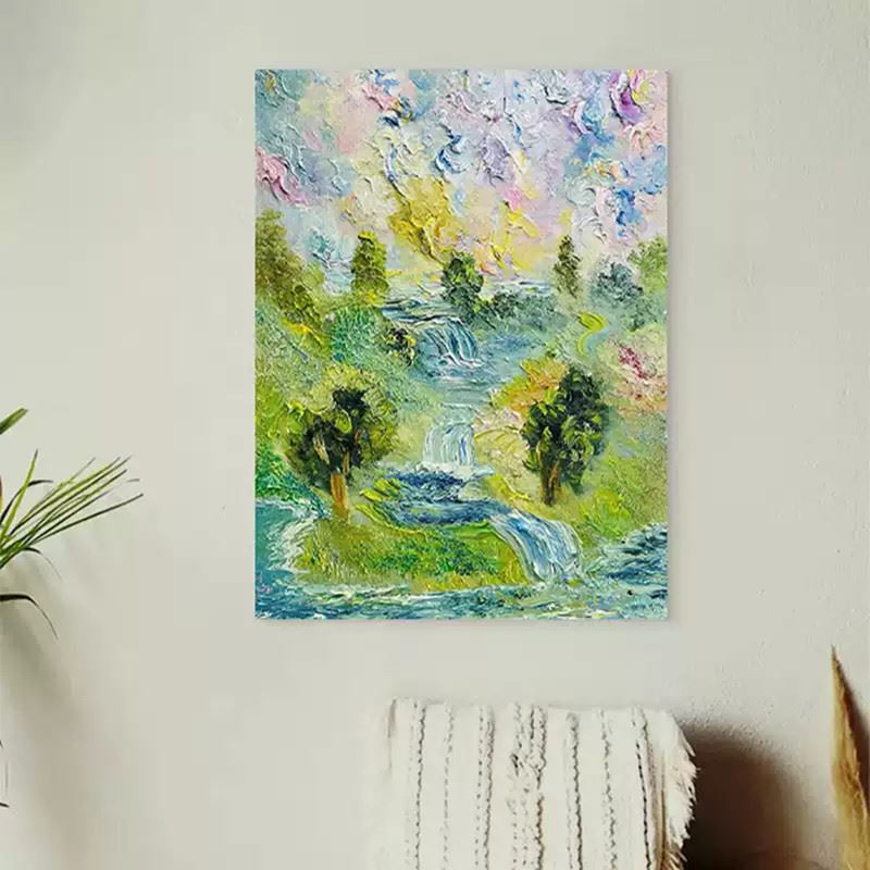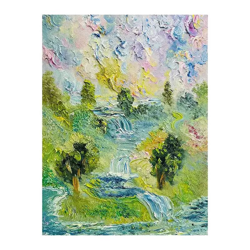 This painting depicts a waterfall flowing like gold, symbolizing the continuous flow of wealth and good fortune, with the movement of water in the mountains bringing infinite vitality and hope. Dimensions: 24 x 31 inches.