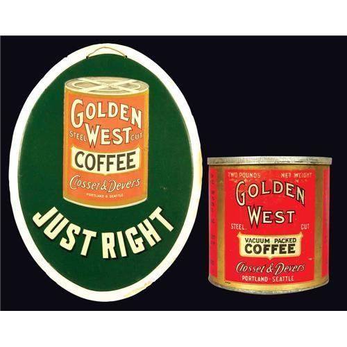 Golden West Embossed Oval Cardboard String Hanger and Coffee Tin. Slight stains at 3:00 and 5:00 on the sign otherwise very good condition. 13 X 17 inches. Tin is in good condition.