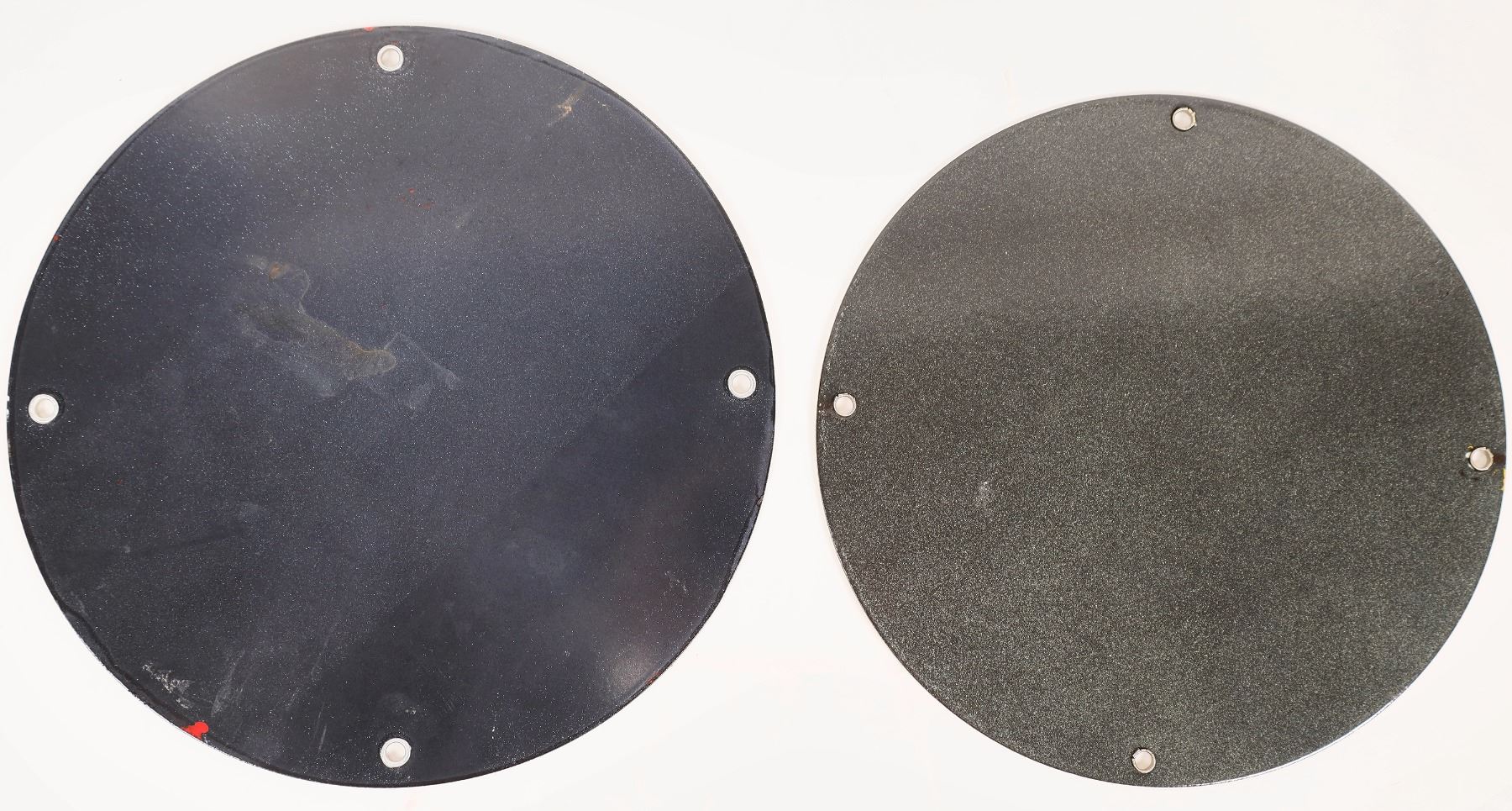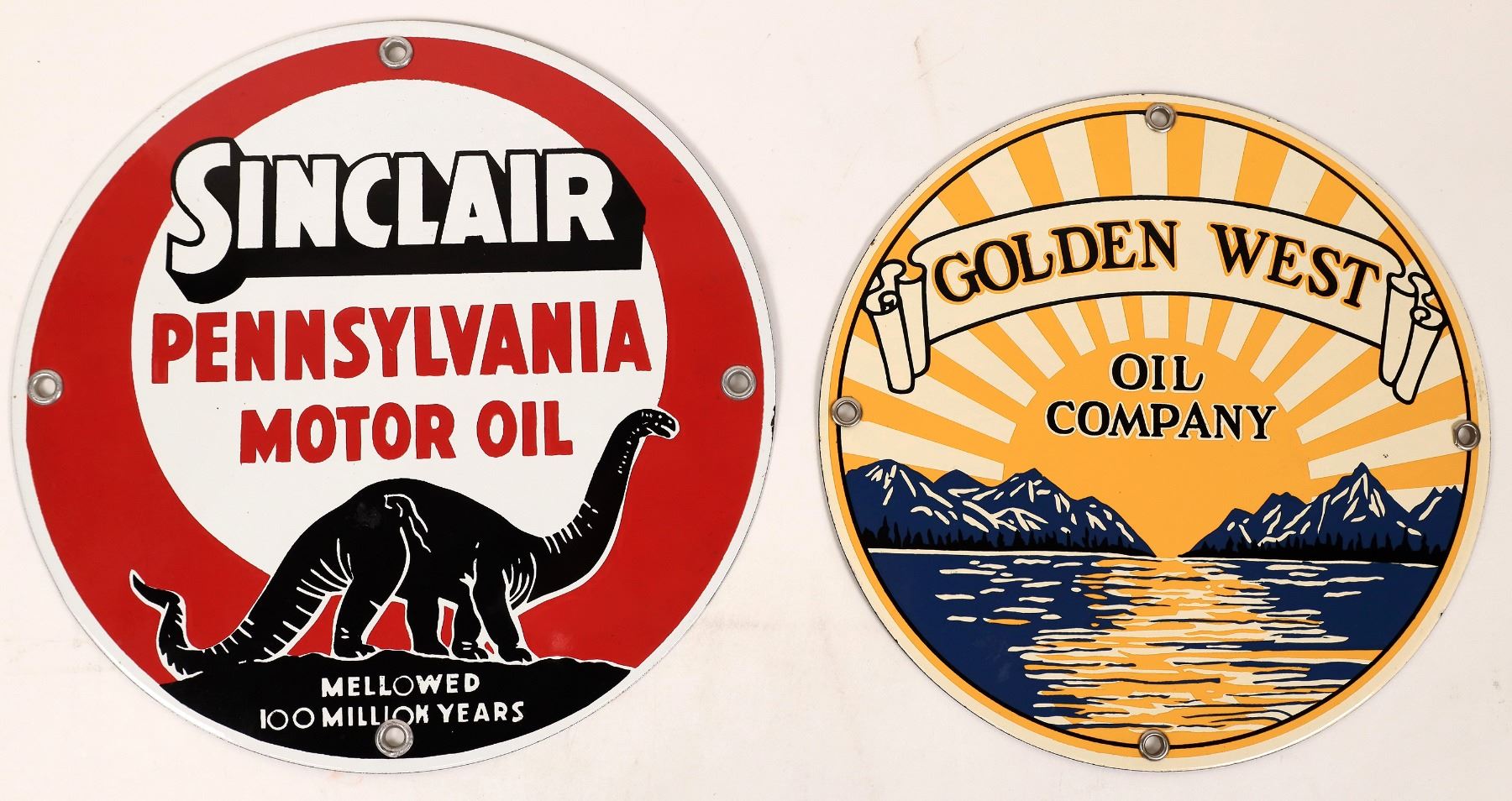 1) Golden West Oil Company with Sunset Reproduction Circle Round Aluminum Sign. 10" diameter. Brontosaurus vignette. 2) Sinclair Pennsylvania Motor Oil; mellowed 100 million years. Reproduction aluminum. Very heavy. Extremely nice condition. Showy pieces.