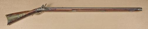 Golden-age flintlock “Kentucky” rifle, unsigned showing fancy pierced and engraved Lancaster style patchbox with wide faceted butt and 18th century features. The rifle measures 58-1/2” overall, with 42” medium to slightly heavy weight barrel of approx. .52 caliber, 7 deep groove rifled. The rifle has been somewhat crudely reconverted to flint. The metal surfaces have been cleaned and show a grey patina with some scattered light to moderate erosion and pinprick pitting. The barrel shows a additional dove-tail for sight, which is 12-1/2” further down the barrel as the original owner aged and became nearsighted. The stock shows replacement of wood, heavy cleaning and sanding, and is only a fair to poor restoration. The cheek piece shows an 8-pointed Bethlehem type star in silver. The triggerguard is faceted to match the butt, the sideplate is lightly engraved with two screw-holes. There is a silver plaque inlaid at the wrist. The rifle is equipped with double set triggers and the stock is very restorable and not sanded down too far. A good gunsmith could bring this rifle back to life and it was a quality gun in its day which we would date about 1790’s. The rifle measures approx. 1-1/8” across the widest