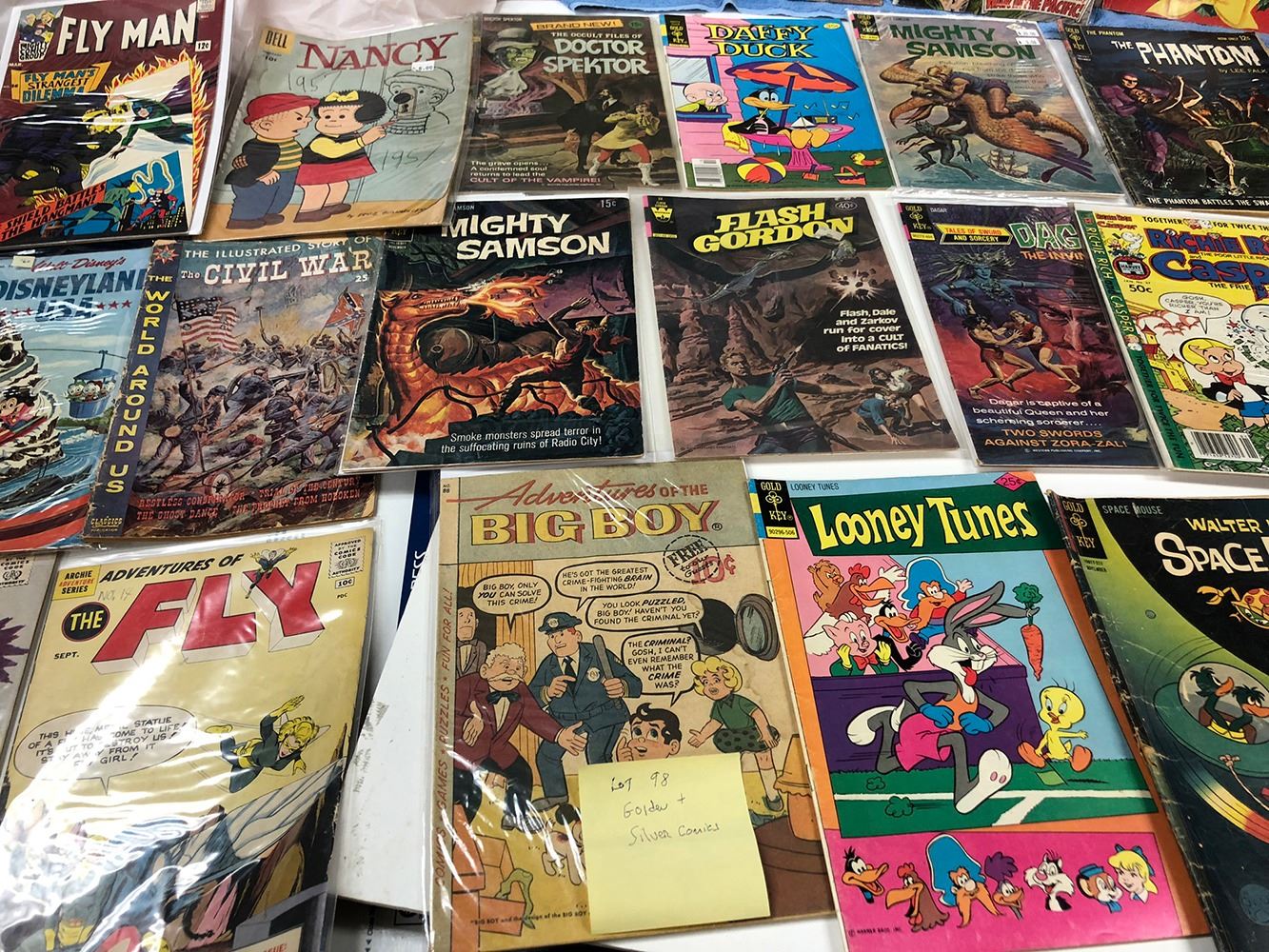 Golden and Silver Comic Book collection includes Flash Gordon Mighty Samson, Blondie, Green Hornet, Loonie Tunes, The Phantom, Blue Beetle, Captain Marvel, Huckleberry Hound, Oswald, 77 Sunset Strip, Popeye, Combat Kelly, GI Joe, Hopalong Cassidy, Beetle Bailey, etc.