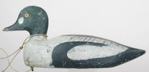 Goldeneye drake from Onset, Massachusetts, by an unknown maker.  Glass eyes, mostly original paint, possibly some touch up on the in the black areas. (decoy)