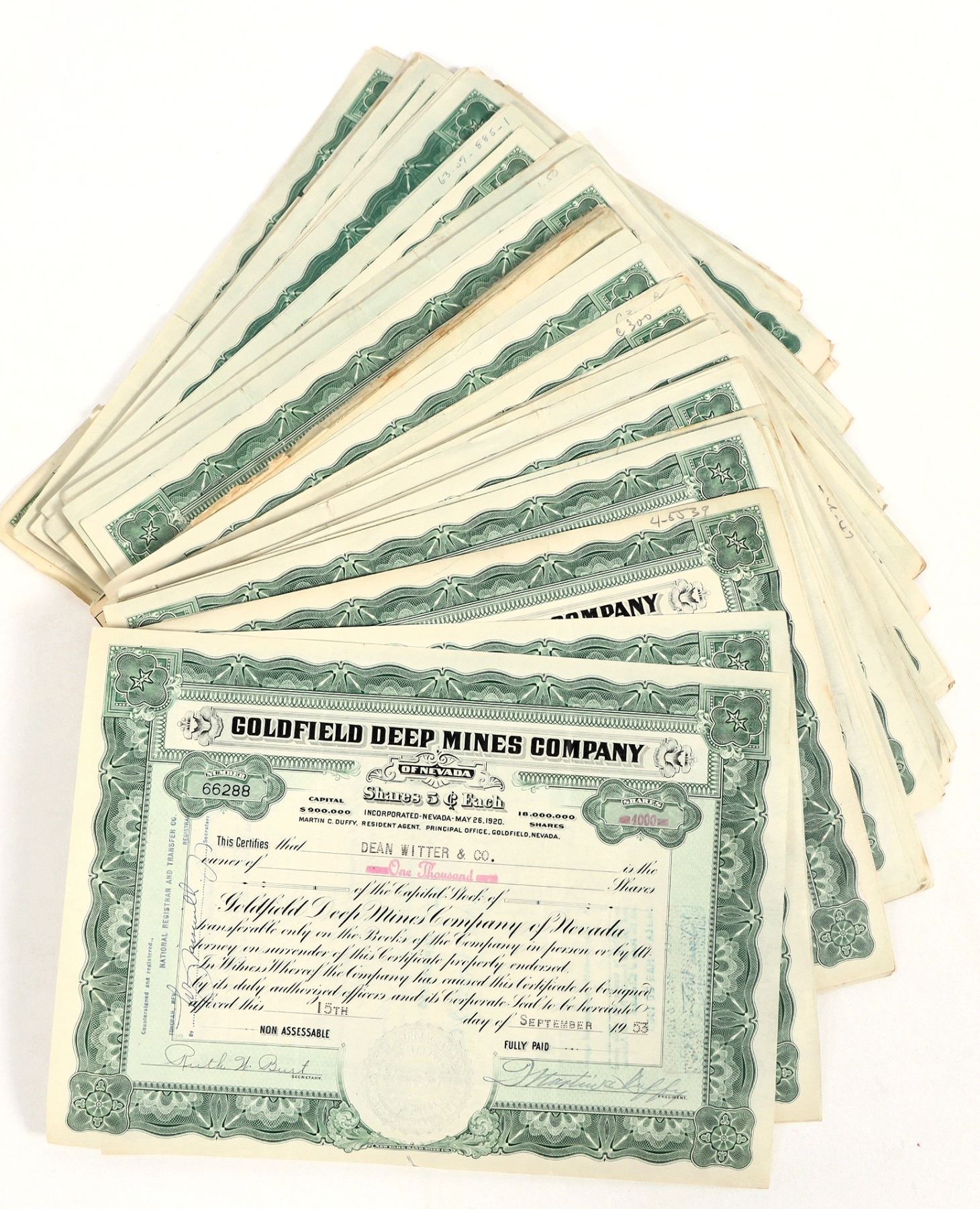 100+.I/U. Issued 1922-66. VF or better. Goldfield Deep Mines Co, Nevada. New York BNC printer.