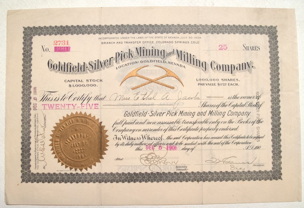 Very rare great piece! Stock number 2731 for 25 shares to Miss Ethel Jacobs in 1906. Great golden crossed picks in middle of stock certificate.
