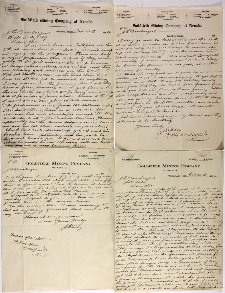 1) A 2-page letter dated 10 October 1904 from the Goldfield Mining Company of Nevada. 2) Another 2-page letter from the Goldfield Mining Company. Dated 26 October 1904. Both letters inquire to Ernest Bamberger in Salt Lake City about mining in the area. Letters have very little wear. -60301