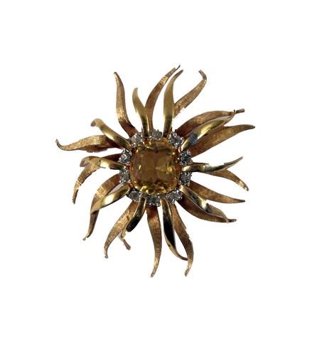 This brooch with gold leaves outstretching from a large tan-colored topaz encircled by diamonds was used in the production of 1964's Goldfinger starring Sean Connery and Honor Blackman, the third Bond film to be produced. Made of metal and plastic. Approx. 2" in diameter.