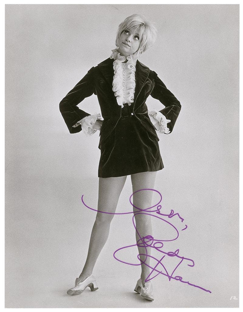Attractive double-weight semi-gloss 7.25 x 9.25 photo of the actress early in her career, signed in purple felt tip “Love, Goldie Hawn.” In fine condition.