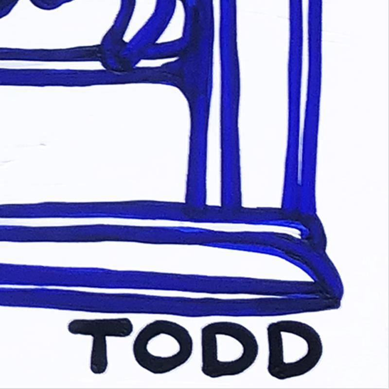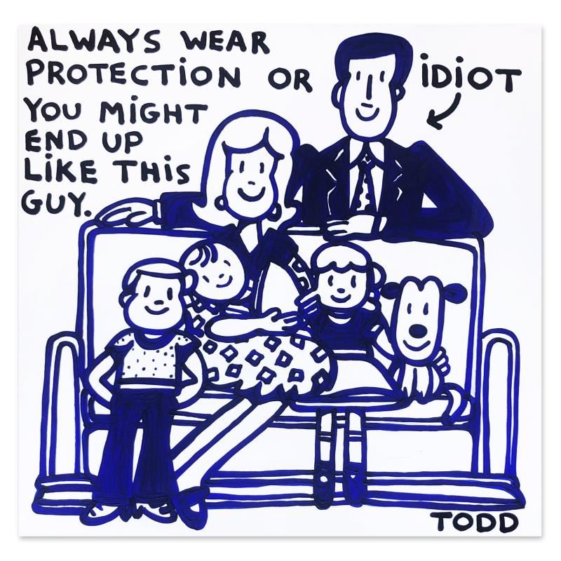 "Idiot" is an original acrylic painting on gallery wrapped canvas by Todd Goldman. The piece is hand signed by the artist and includes a letter of authenticity. Measures approximately 48" x 48" (image).