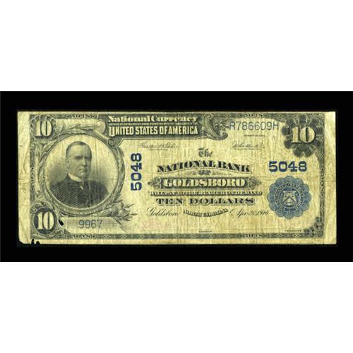 <B>Goldsboro, NC</B></I> - $10 1902 Plain Back Fr. 632 <B>The NB of Goldsboro</B></I> Ch. # 5048<BR> The technical grade would be the higher of the split but a mouse has left its mark on this otherwise problem free note. <B>Very Good-Fine</B></I>.<BR><BR><b>Shipping:</b> Coins & Currency (<a target="_blank" href="http://www.heritageauctions.com/common/shipping.php">view shipping information</a>)