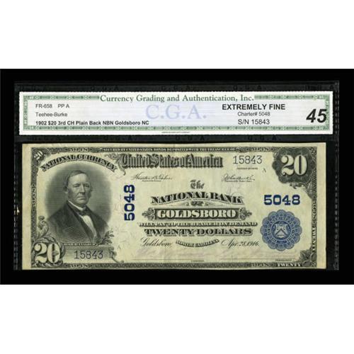 <B>Goldsboro, NC</B></I> - $20 1902 Plain Back Fr. 658 <B>The NB of Goldsboro</B></I> Ch. # 5048<BR> Perhaps the finest known of this type from this issuer. Purple signatures are still visible. <B>CGA Extremely Fine 45</B></I>.<BR><BR><b>Shipping:</b> Coins & Currency (<a target="_blank" href="http://www.heritageauctions.com/common/shipping.php">view shipping information</a>)