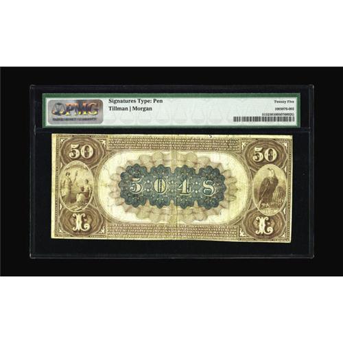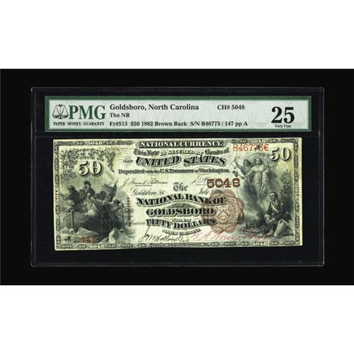 <B>Goldsboro, NC</B></I> - $50 1882 Brown Back Fr. 515 <B>The NB of Goldsboro</B></I> Ch. # 5048<BR>Previously offered as lot 17888 in our 2006 Central States Signature Auction, this attractive note was described, "This note is a true miracle of survival, as it is one of only four $50 Brown Backs known from the entire state and the only example recorded from outside of Asheville. It's also the finest known for this type and denomination from North Carolina by at least a full grade. Pen signed, with the margins trimmed closely around the entire note..." Our grading opinion of Very Fine was duly enforced by a third party grading service, <B>PMG Very Fine 25.</B></I> We must note that this well-executed design was listed as No. 72 in the book <I>100 Greatest American Currency Notes.</B></I><BR><I>From The Troy Wiseman Collection</B></I>