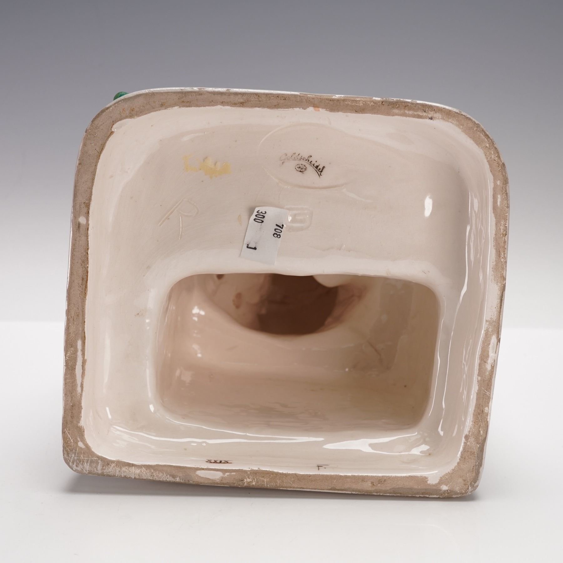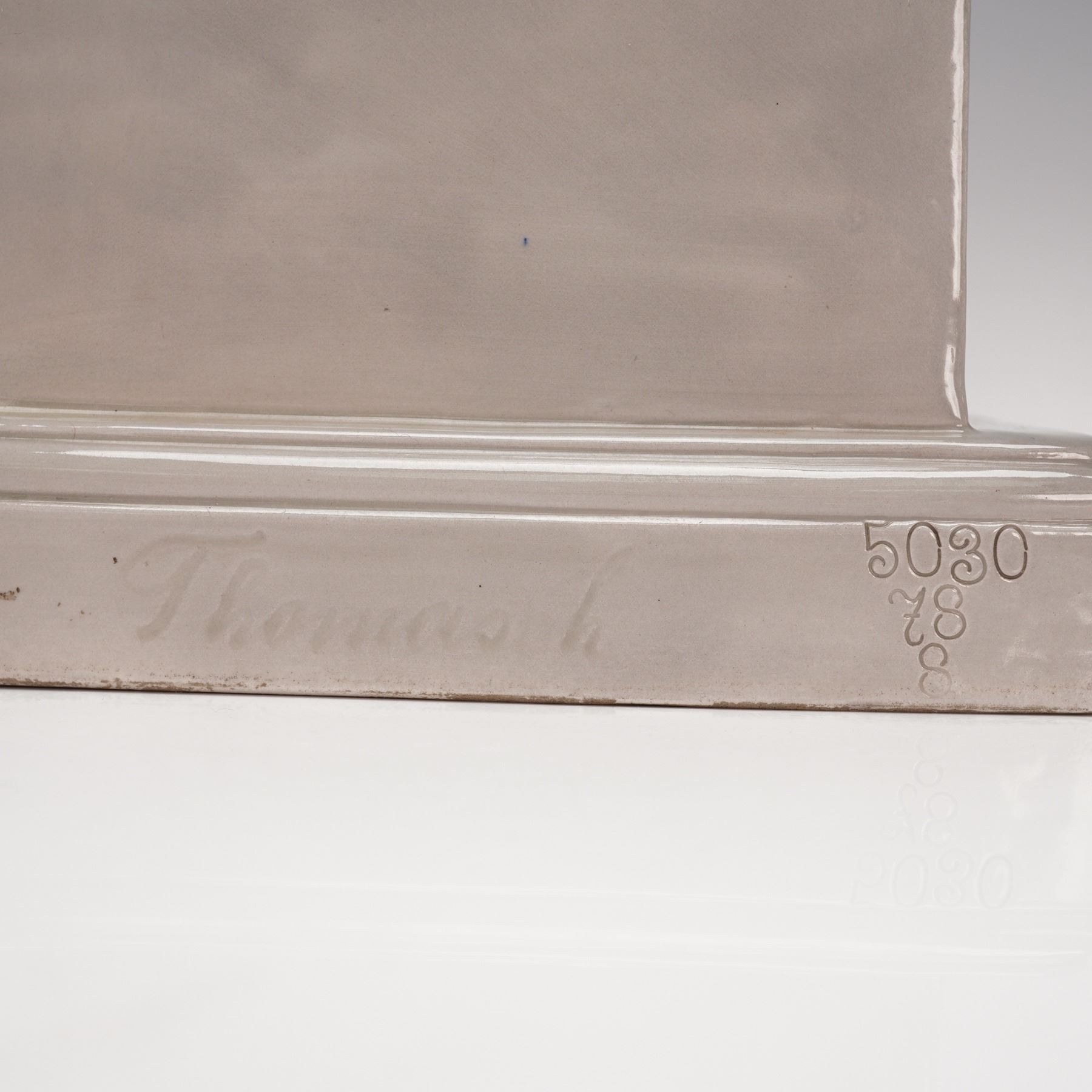 Elegant figurine by Goldscheider, designed by Thomasch, depicting a seated female Pierrot in a mint green costume with ruffled collar, holding a mandolin. The figure is finely modeled with delicate facial features and lustrous glaze highlights, capturing the refined Art Deco aesthetic characteristic of Goldscheider works. Marked to base with impressed signature Thomasch and model number 5030, along with Goldscheider backstamp.