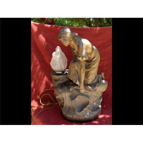 This is delightful,a beautiful Art Nouveau maiden collecting water.Made c1900 by GOLDSCHEIDER and signed Petrie in the form of a lamp,she has lost something from her left hand although this was never attached as there is NO damage,except for tiny nicks etc to paint