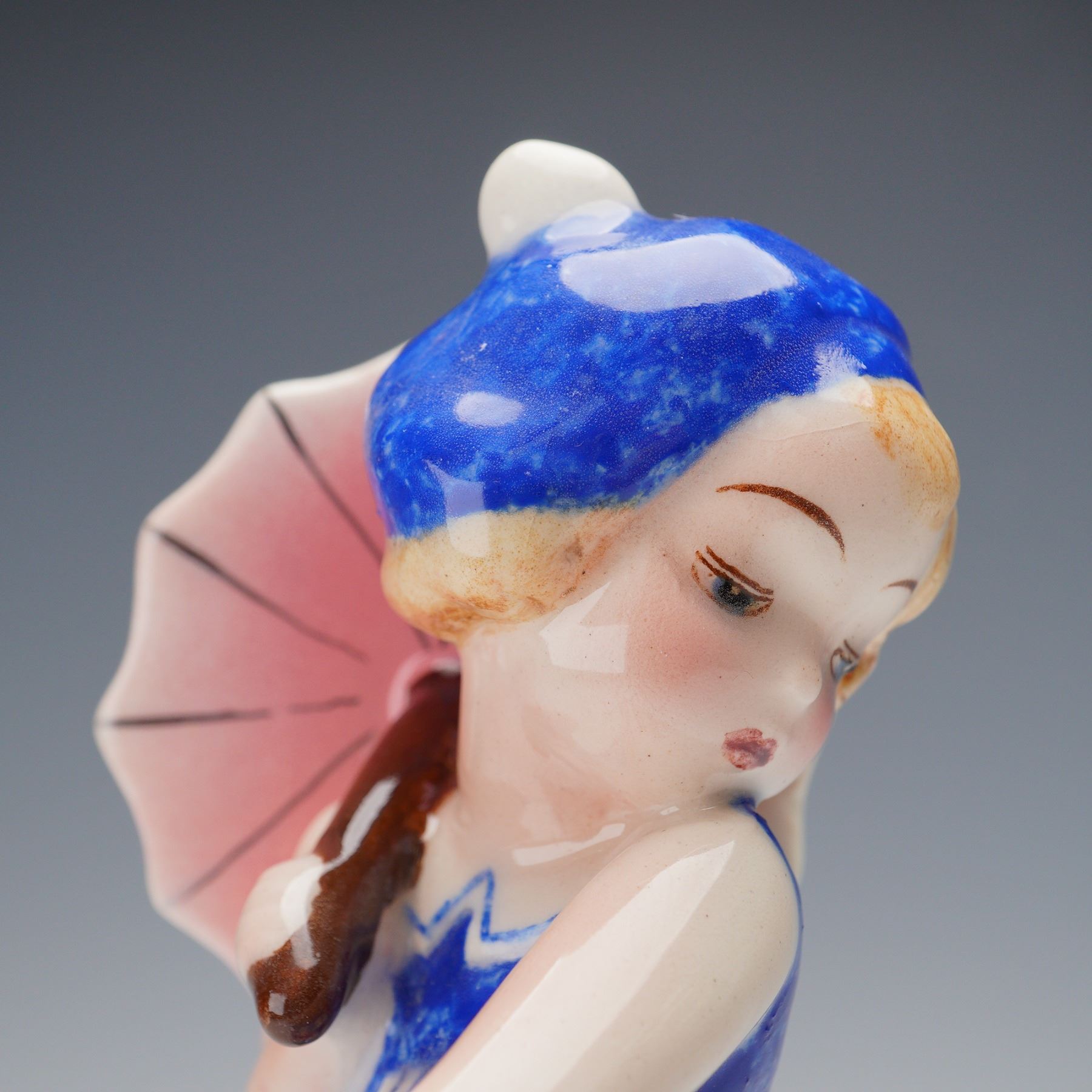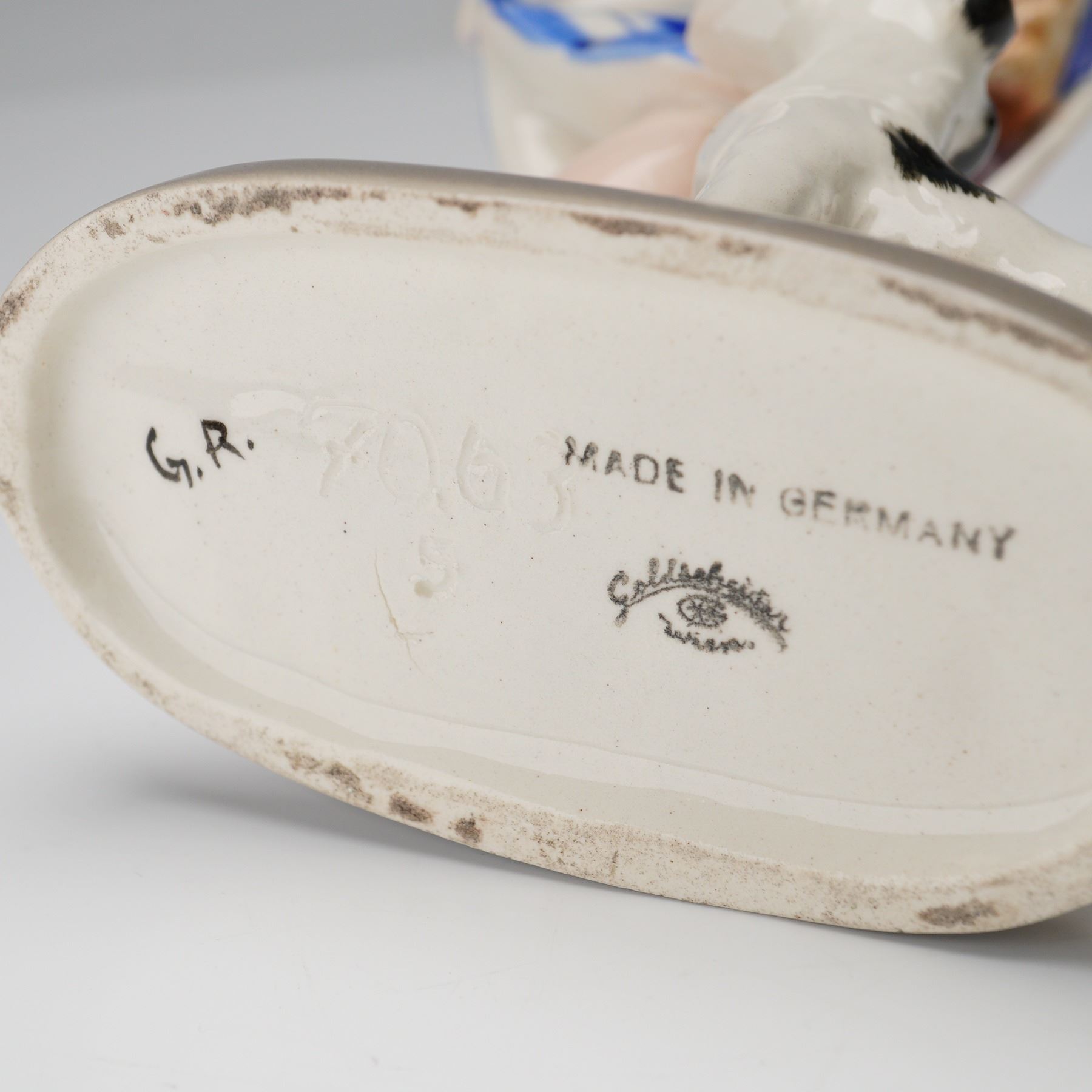 Delightful Goldscheider porcelain figurine modeled by Claire Weiss (Klara Herczeg), depicting a young girl in a blue plaid dress and matching cap, holding a pink parasol as her small terrier dog looks up at her. The piece reflects the charming style of French illustrator Germaine Bouret, whose playful depictions of children inspired several Goldscheider designs during the mid-20th century. Marked on the underside with the Goldscheider hallmark, impressed model number 7063, and stamped "Made in Germany." A finely modeled and hand-painted example showcasing Goldscheider's renowned craftsmanship and whimsical character studies.