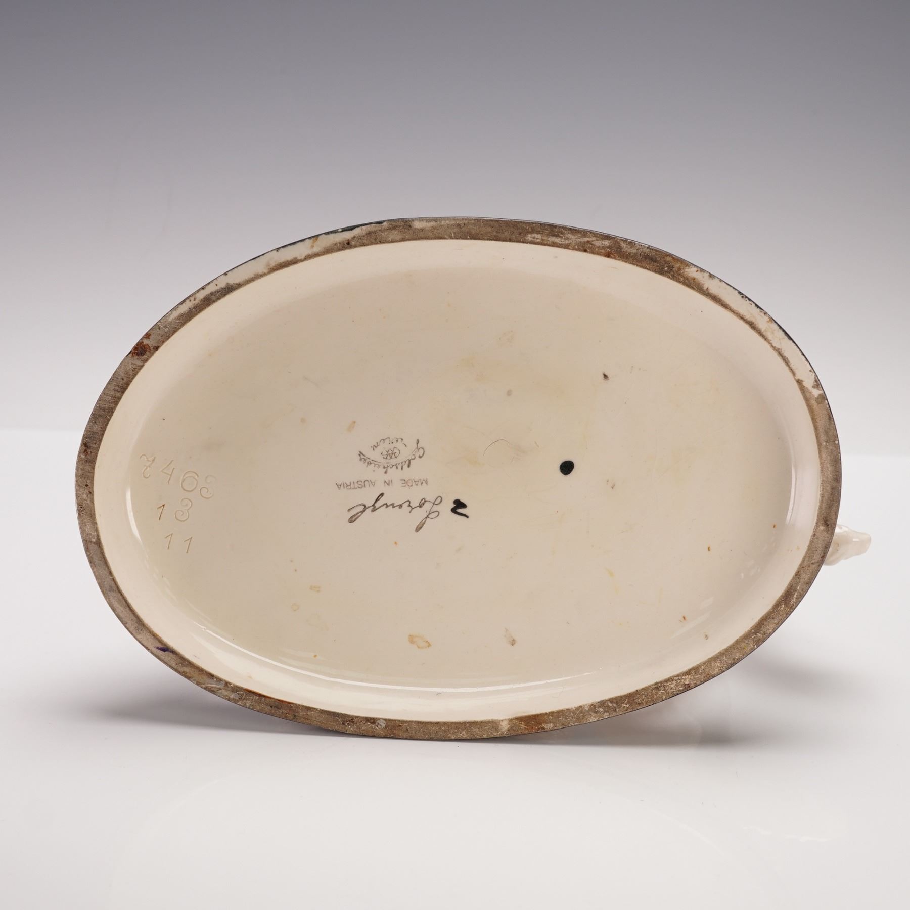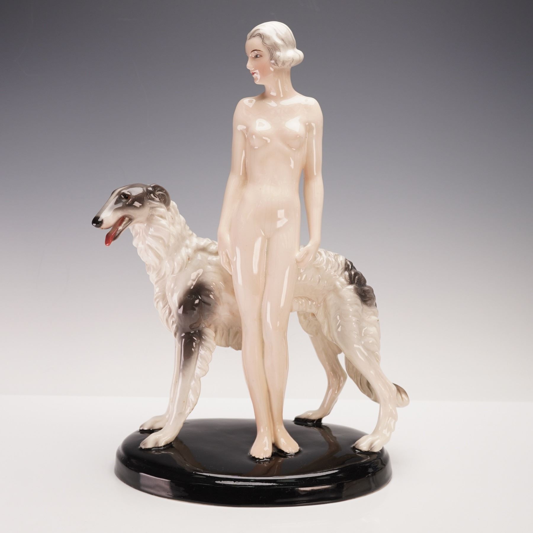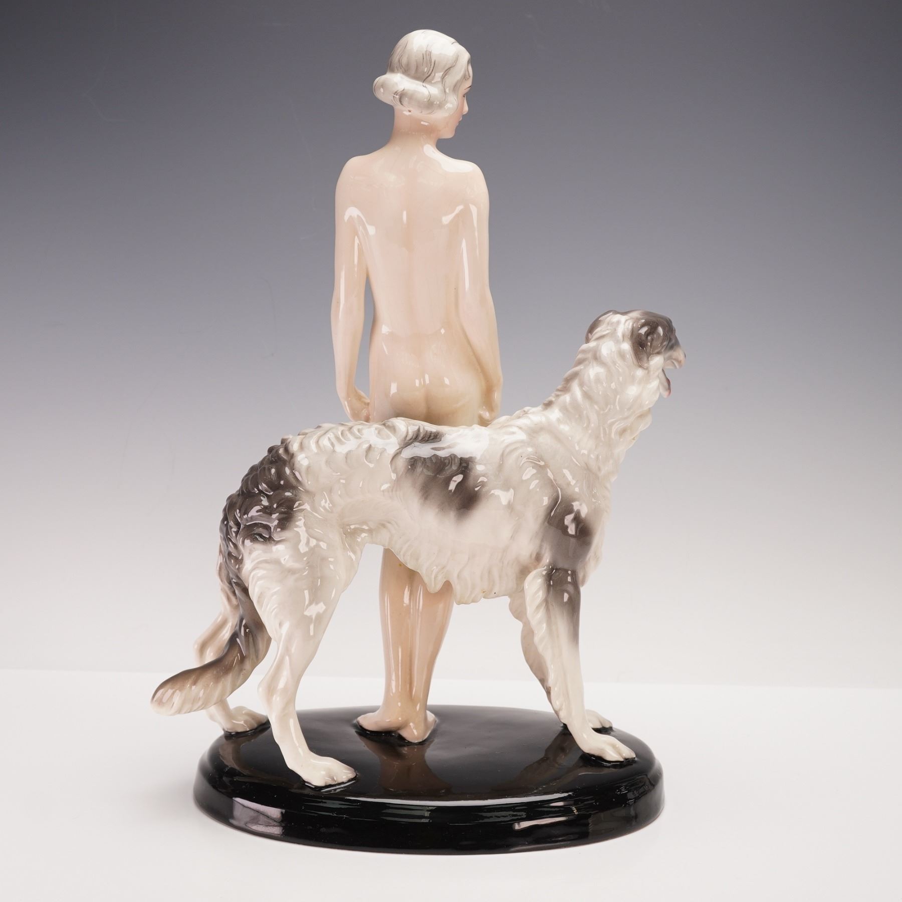 Sculpted with refined Art Deco grace, this porcelain figure by Goldscheider Wien presents a nude woman standing beside her elegant borzoi. The composition reflects Josef Lorenzl's signature balance of sensuality and poise, accentuated by the soft luster of the glaze and the naturalistic detailing of the hound. Signed Lorenzl to the base, impressed with model number 7463 and additional numerals 13 11, and bearing the Goldscheider Wien backstamp.