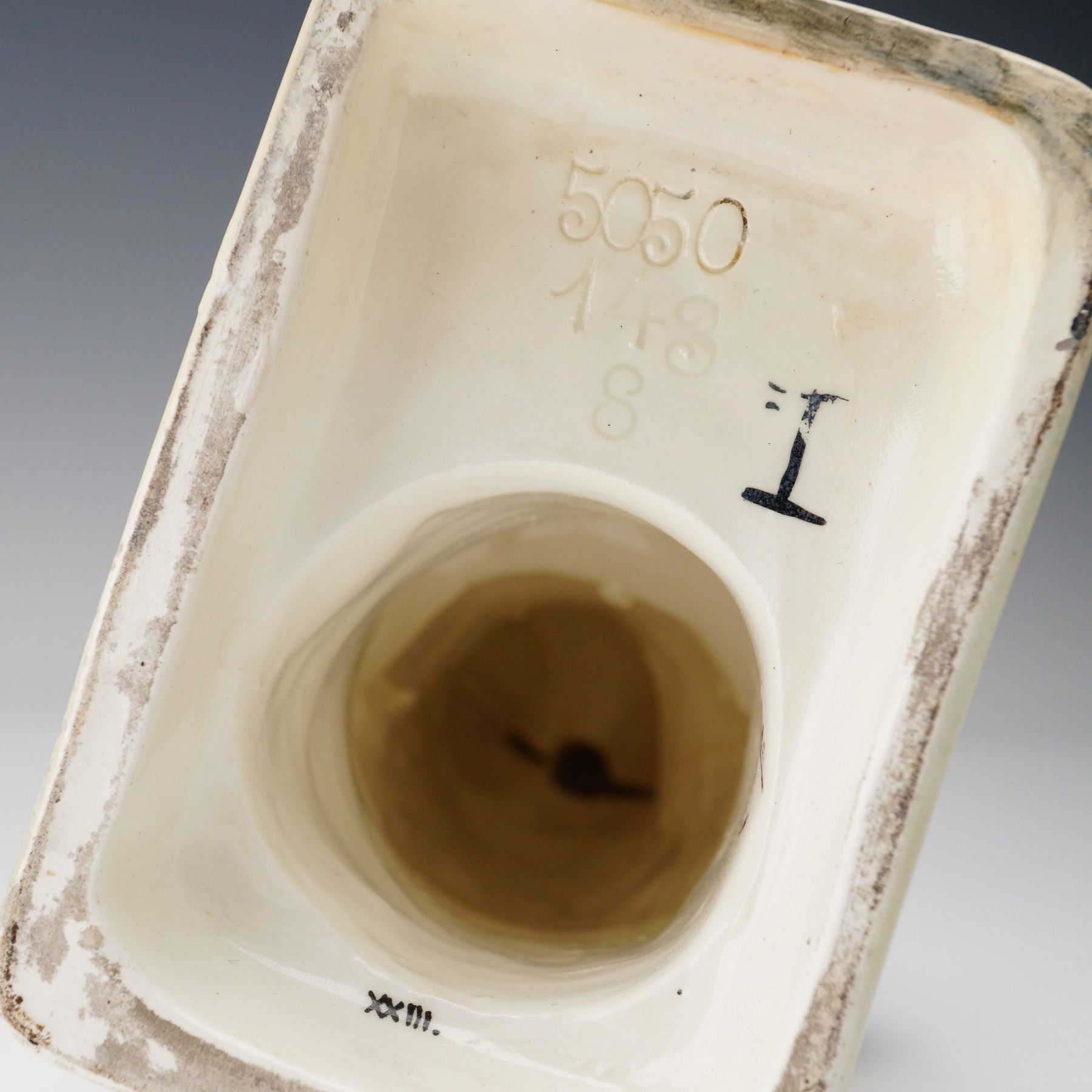 Striking Art Deco porcelain figurine designed by Rudolf Podany for Goldscheider, depicting a seated Pierrette in a harlequin-patterned costume of orange, black, and white, resting gracefully upon a cream and orange pedestal. The figure exhibits the classic elegance and stylized form associated with the Vienna Goldscheider workshop, with delicate facial detailing and dramatic pose. Marked underside with impressed model number 5050, additional incised and painted marks, and factory stamp.