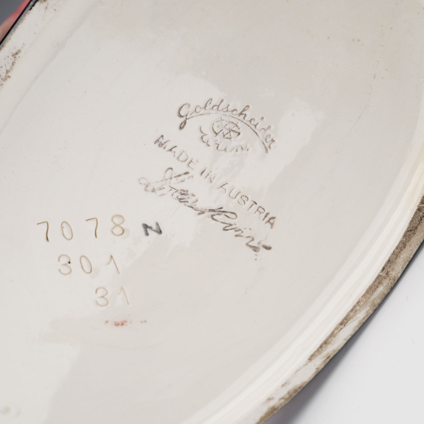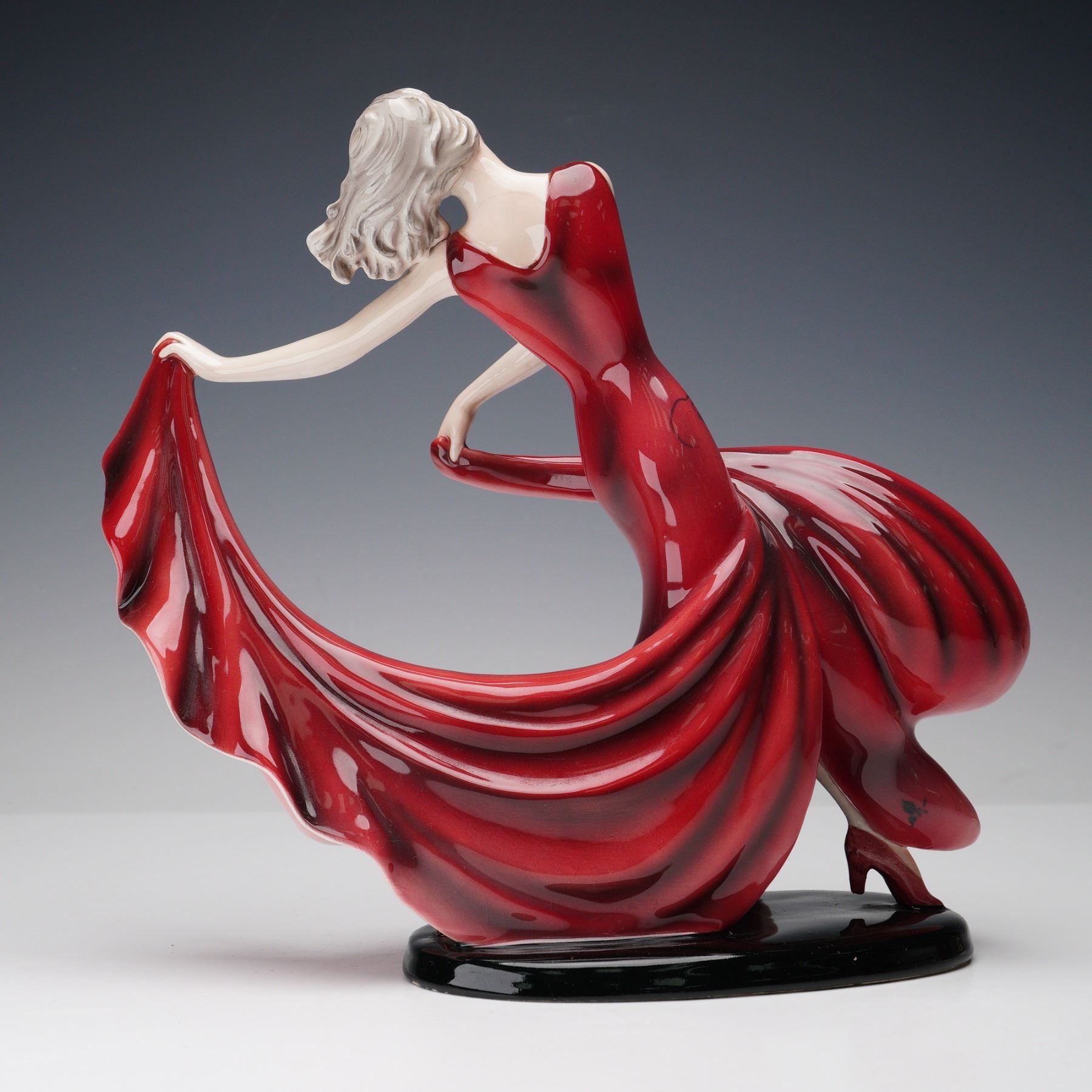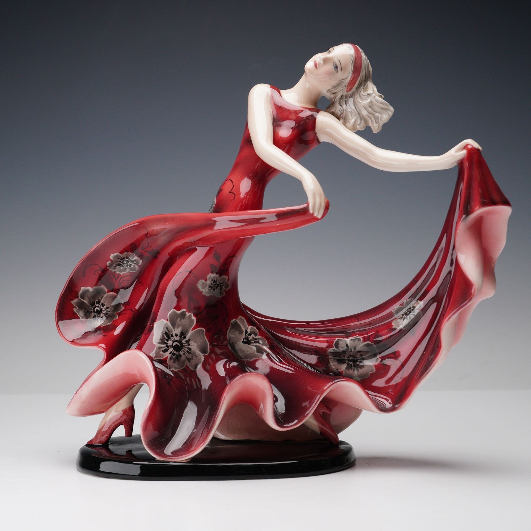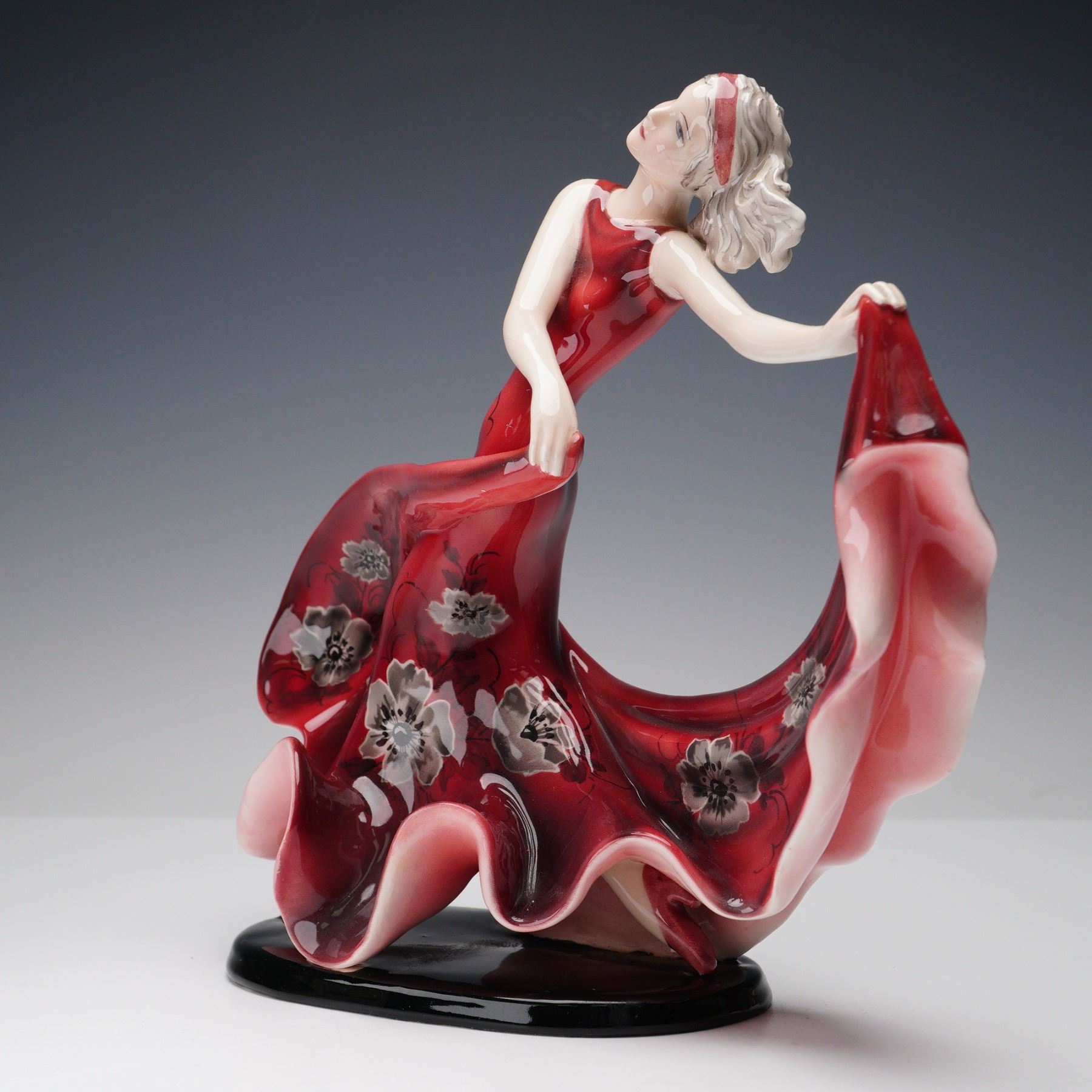Elegant Goldscheider porcelain figurine designed by Stephan Dakon, model 7078, depicting a graceful female dancer poised mid-movement, holding the edges of her flowing red dress adorned with floral accents. The figure exhibits the expressive Art Deco style characteristic of Goldscheider's 1930s creations, with fine attention to detail in the sculpted folds of the gown and the delicate facial expression. Marked Goldscheider, Made in Austria, with impressed and painted numbers to the base.