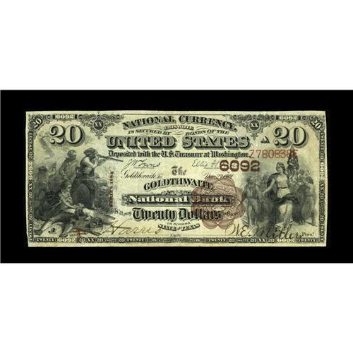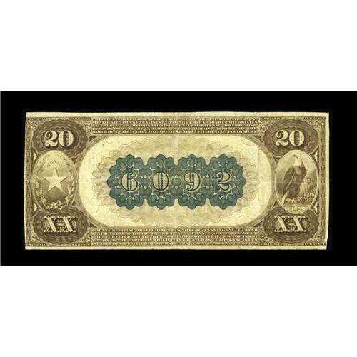 <B>Goldthwaite, TX</B></I> - $20 1882 Brown Back Fr. 504 <B>The Goldthwaite NB</B></I> Ch. # 6092<BR>While 25 serial number 1 Brown Backs are reported from all Texas banks combined, only this piece and one from Itasca are $20 notes. Along with the three matching number 1 tens from here (all of which are known), the borders are a bit irregularly trimmed, and this piece displays a pinhole or two, but the overall appearance here is still more than acceptable, and the rarity here is unquestioned. <B>Very Fine.</B></I><BR><BR><b>Shipping:</b> Coin/Currency (<a target="_blank" href="http://www.heritageauctions.com/common/shipping.php">view shipping information</a>)